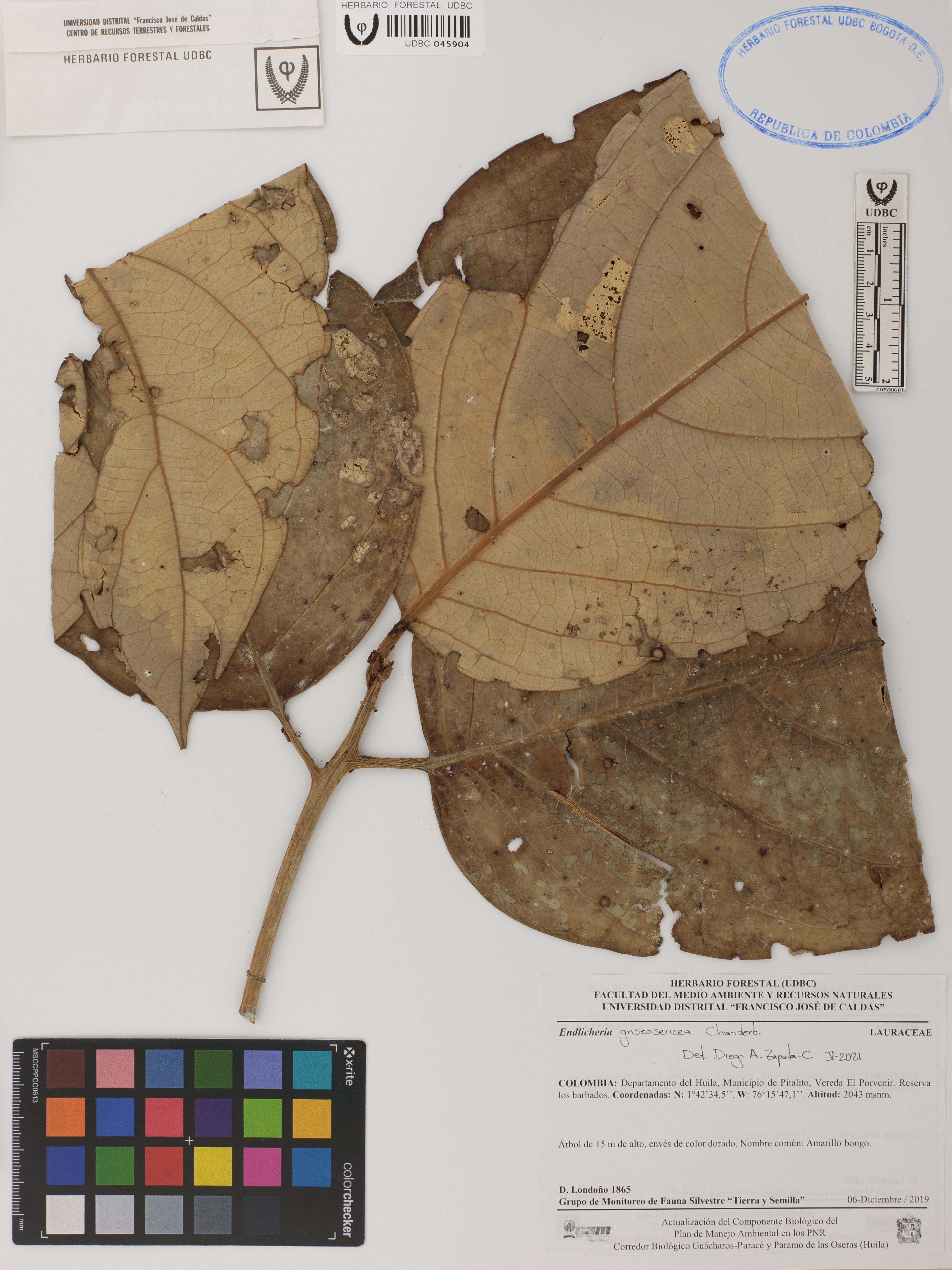 Fotografía del ejemplar Londoño, D. 1865, determinado como Endlicheria griseosericea en el año 2021