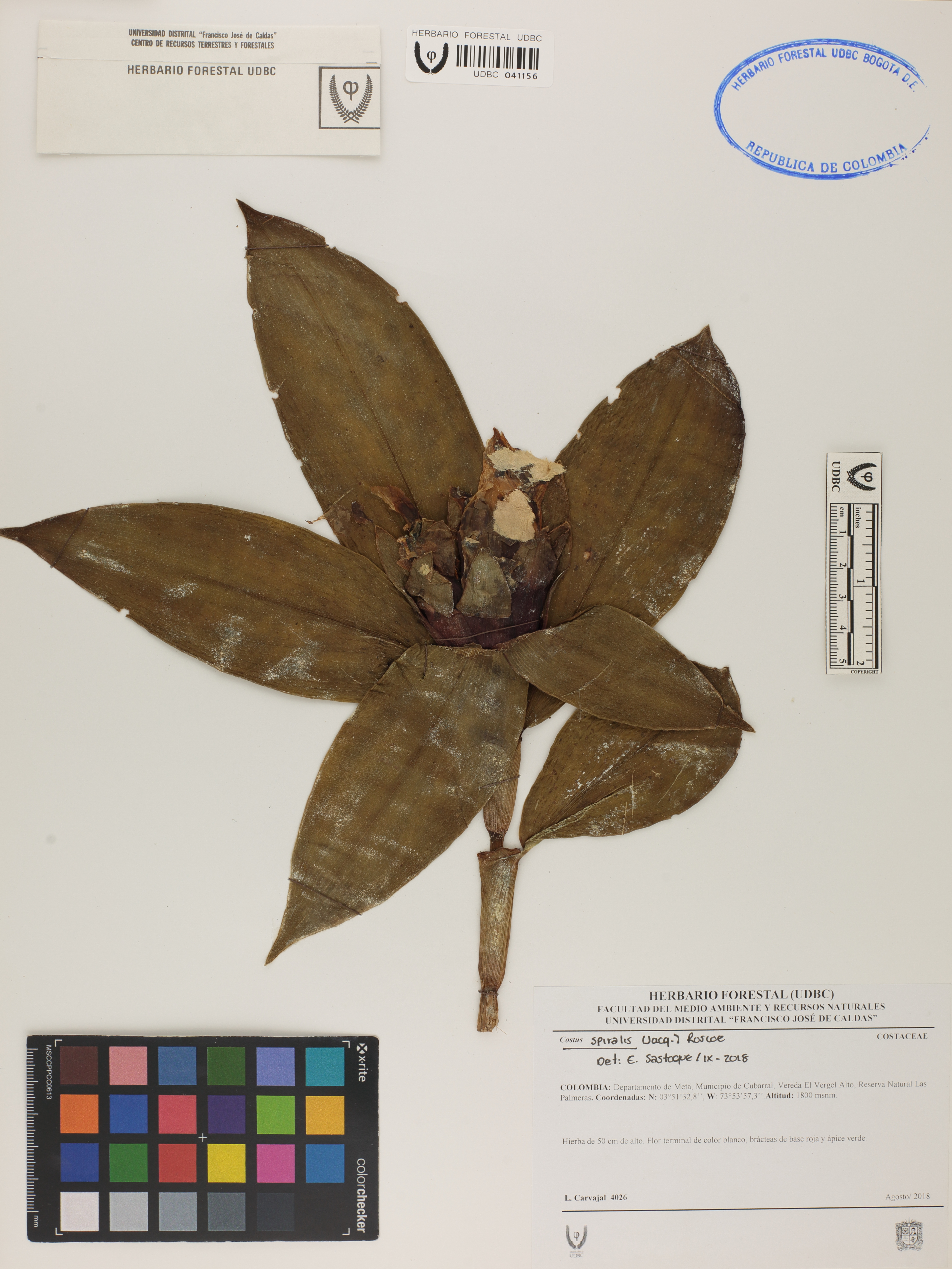 Fotografía del ejemplar Carvajal, L. 4026, determinado como Costus spiralis en el año 2018