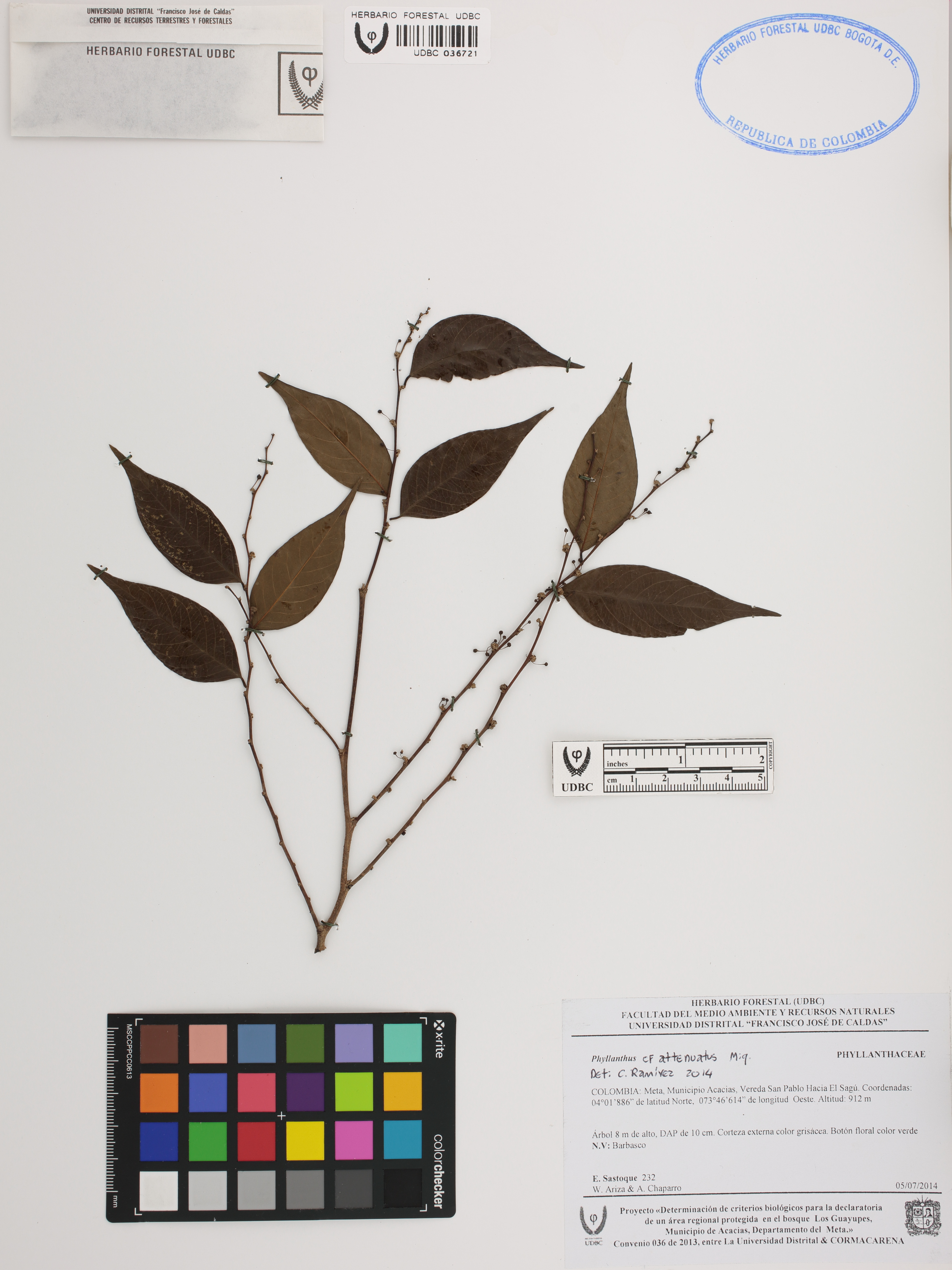 Fotografía del ejemplar Sastoque, E. 232, determinado como Phyllanthus attenuatus en el año 2014