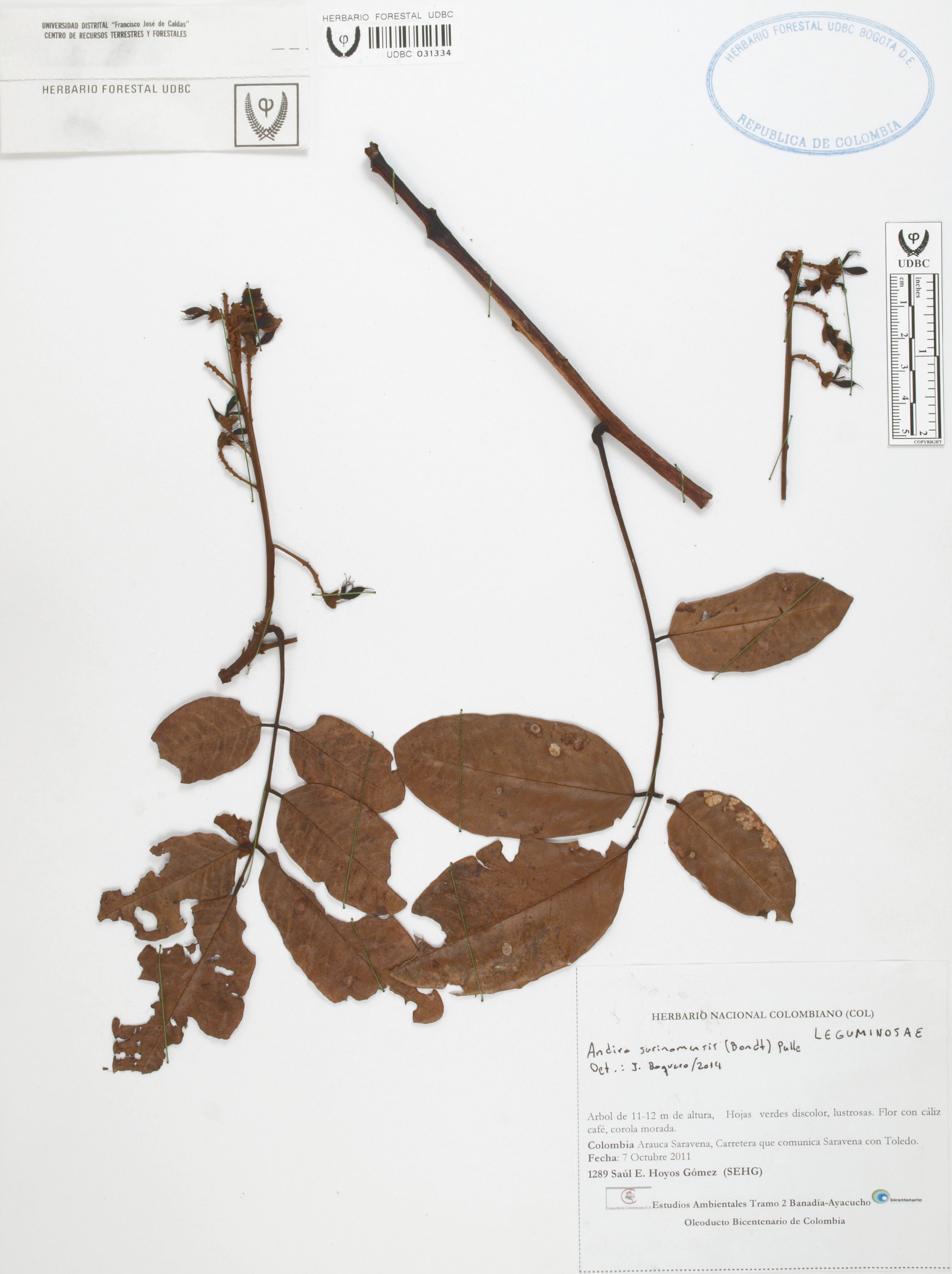 Fotografía del ejemplar Hoyos, S. 1289, determinado como Andira surinamensis en el año 2014
