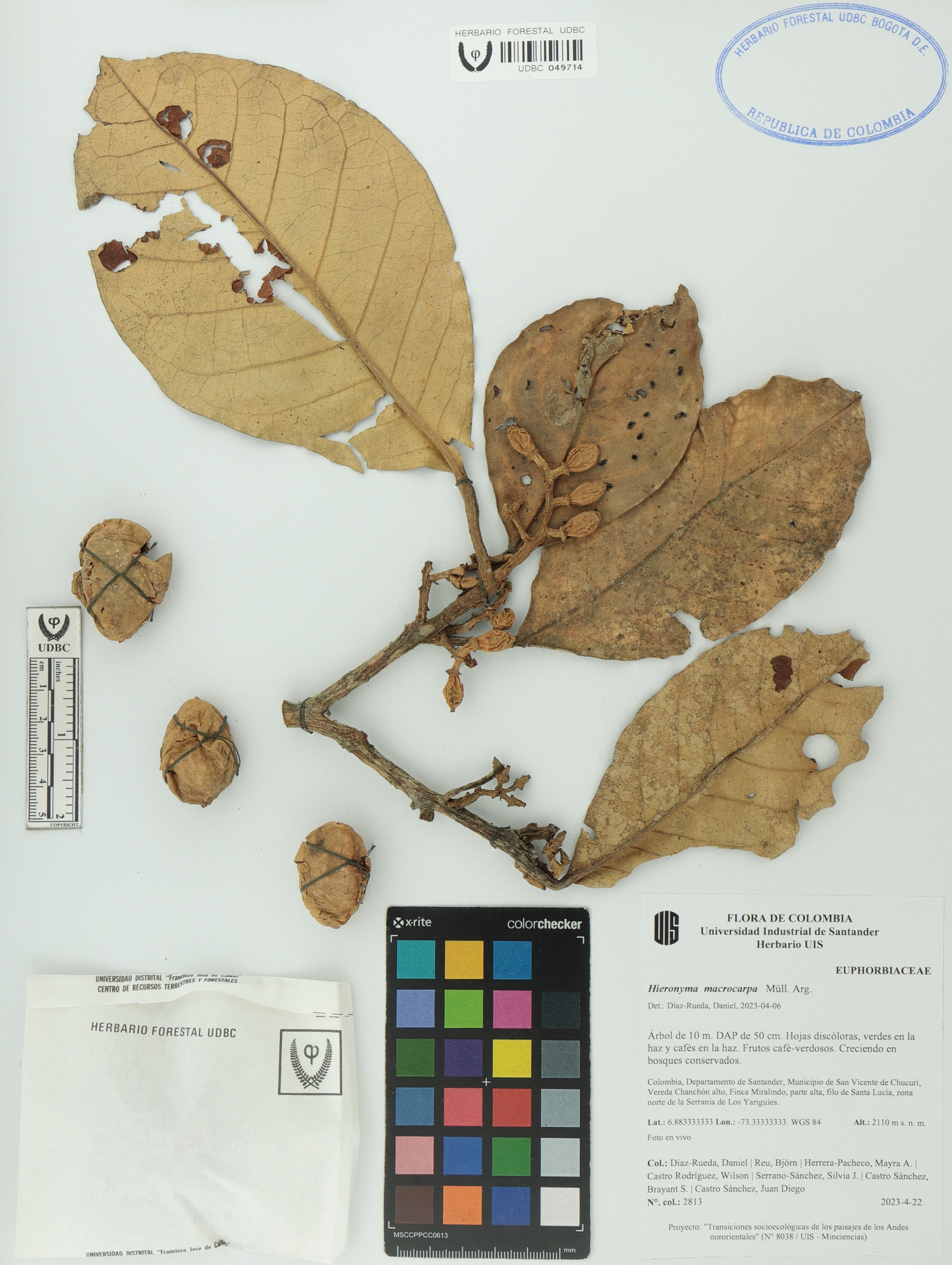 Fotografía del ejemplar Díaz-Rueda, D. 2813, determinado como Hieronyma macrocarpa en el año 2023