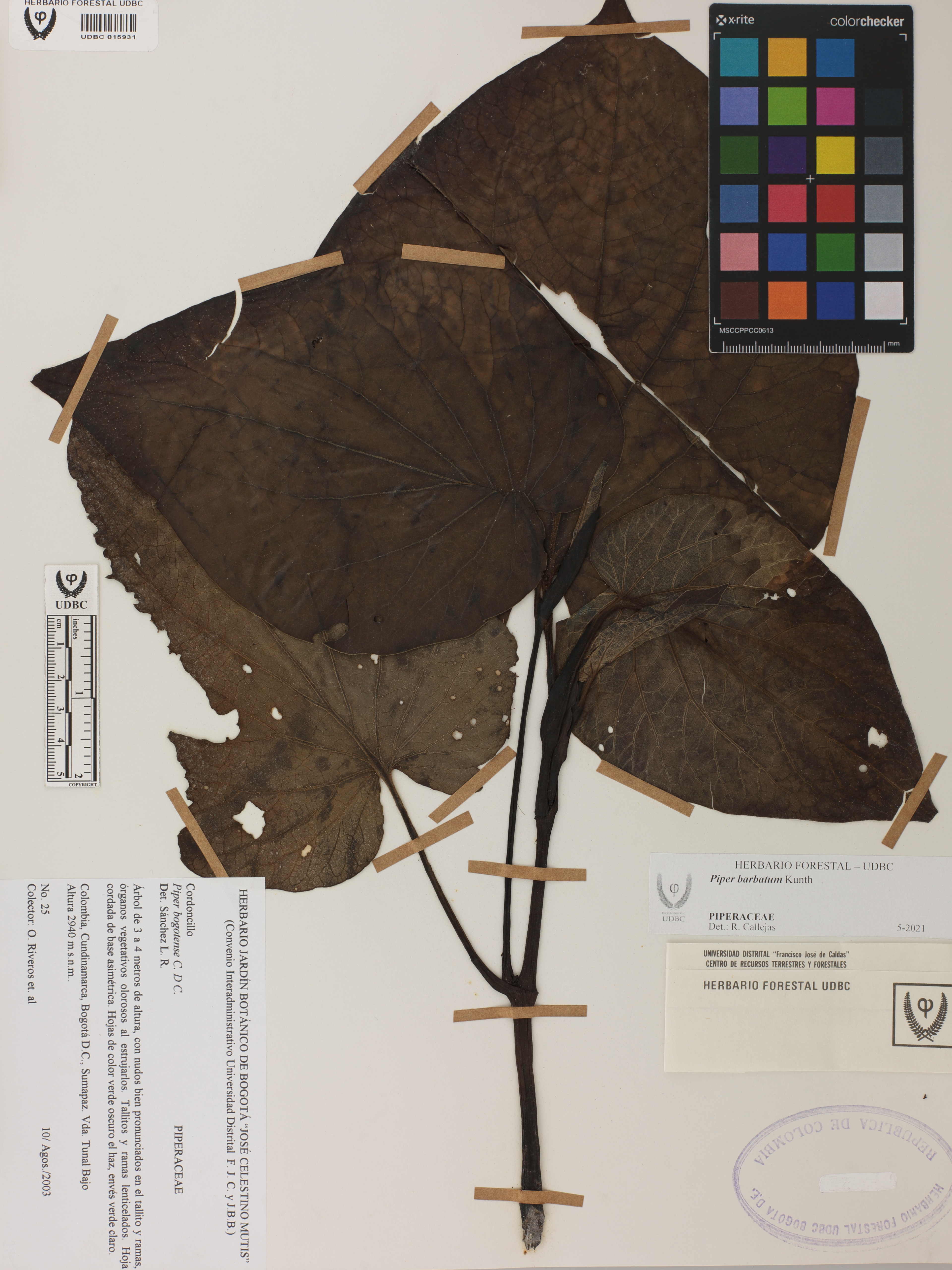 Fotografía del ejemplar Riveros, O. 25, determinado como Piper barbatum en el año 2021