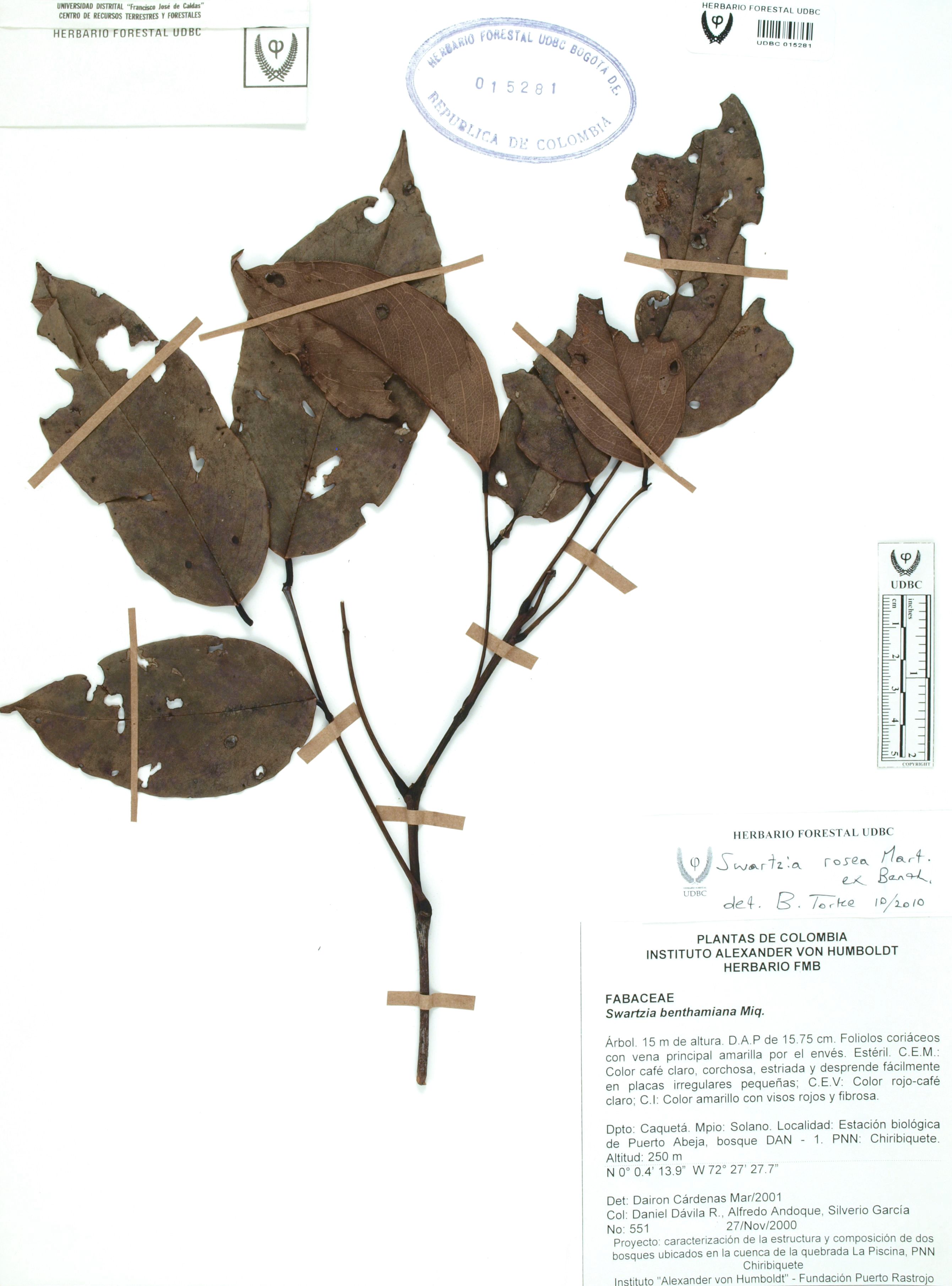 | dc.description | Fotografía del ejemplar Dávila, D. 551, determinado como Swartzia rosea en el año 2010 | |