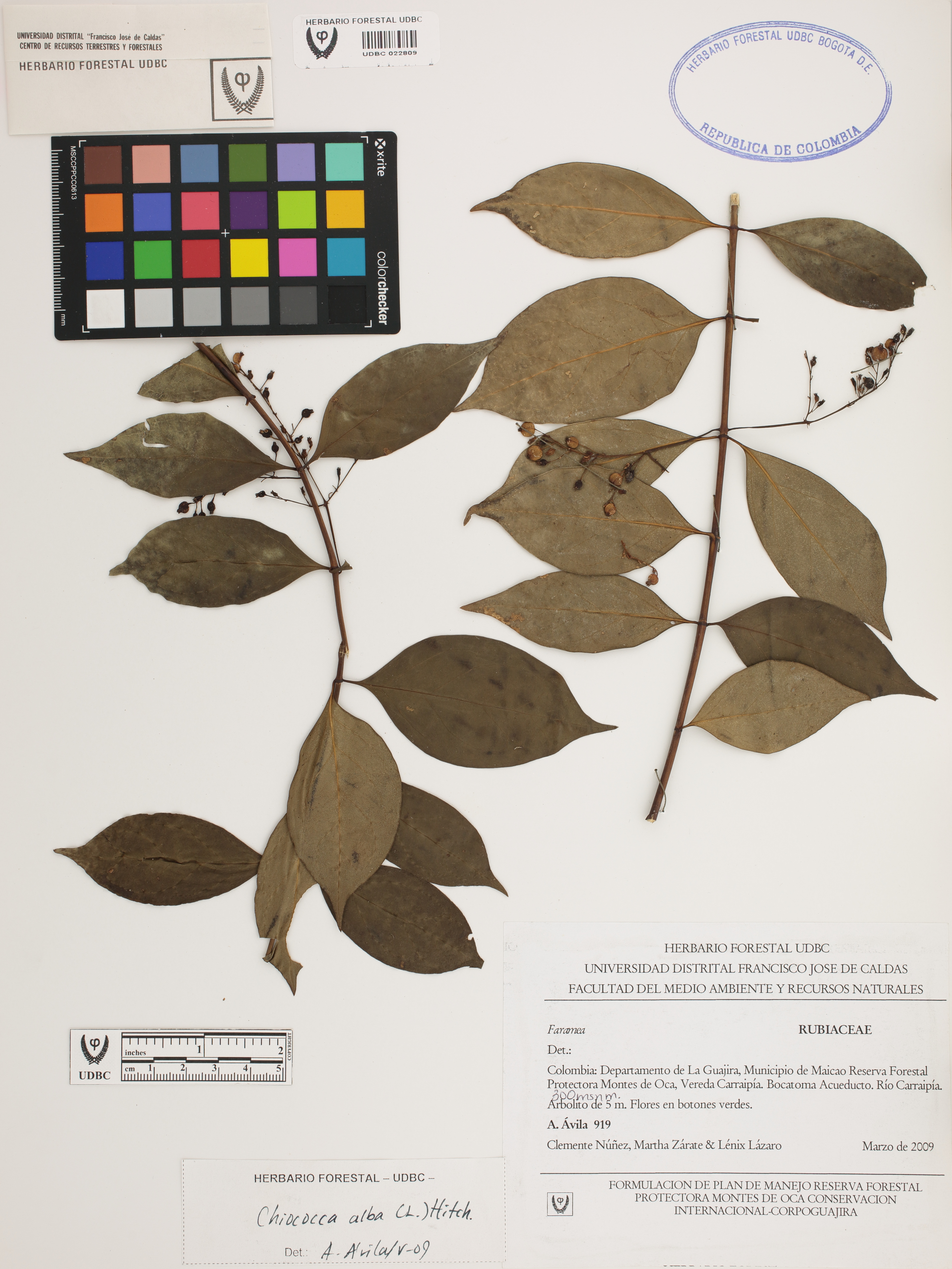 Fotografía del ejemplar Ávila, A. 919, determinado como Chiococca alba en el año 2009