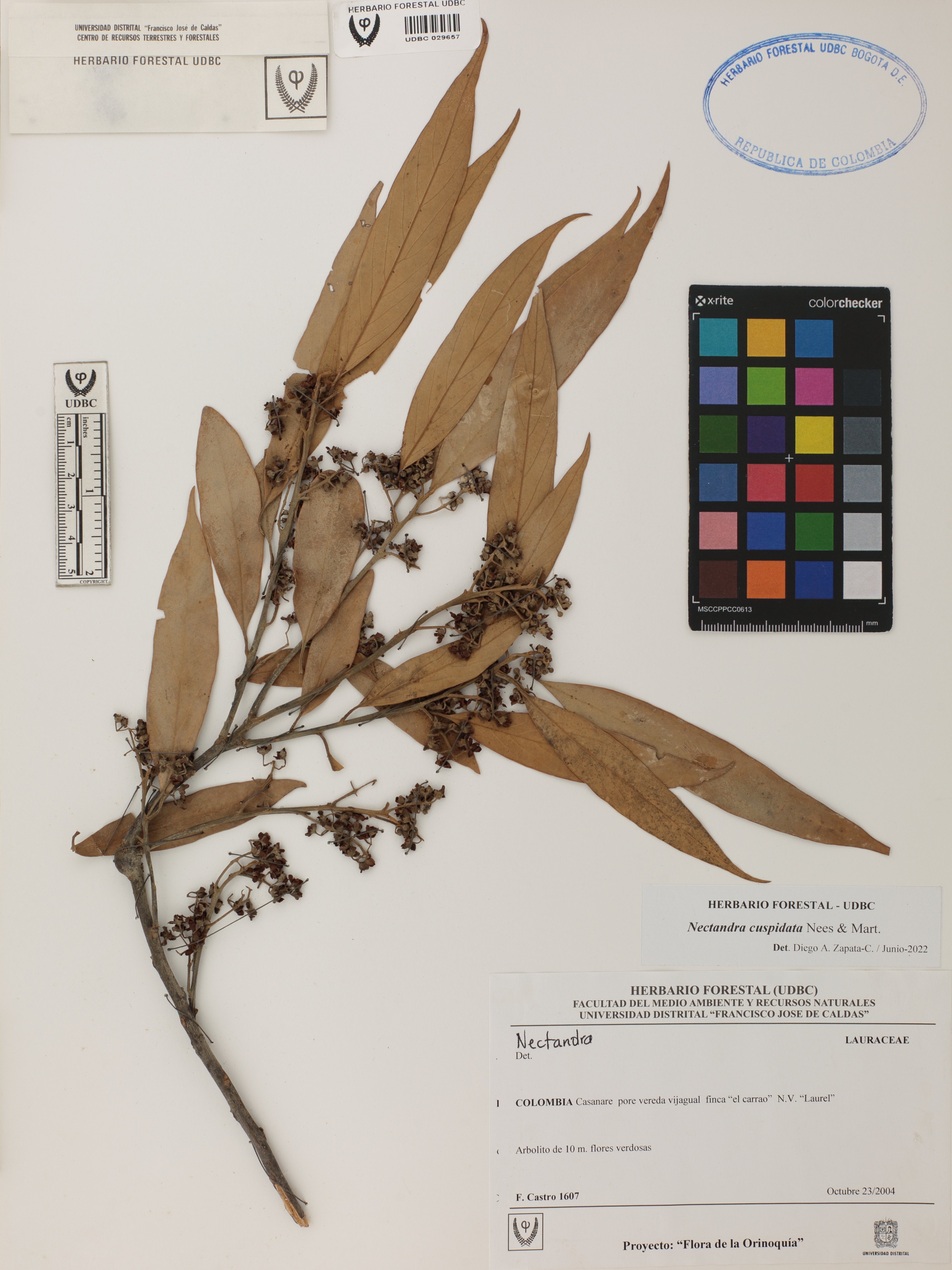 Fotografía del ejemplar Castro, F. 1607, determinado como Nectandra cuspidata en el año 2022