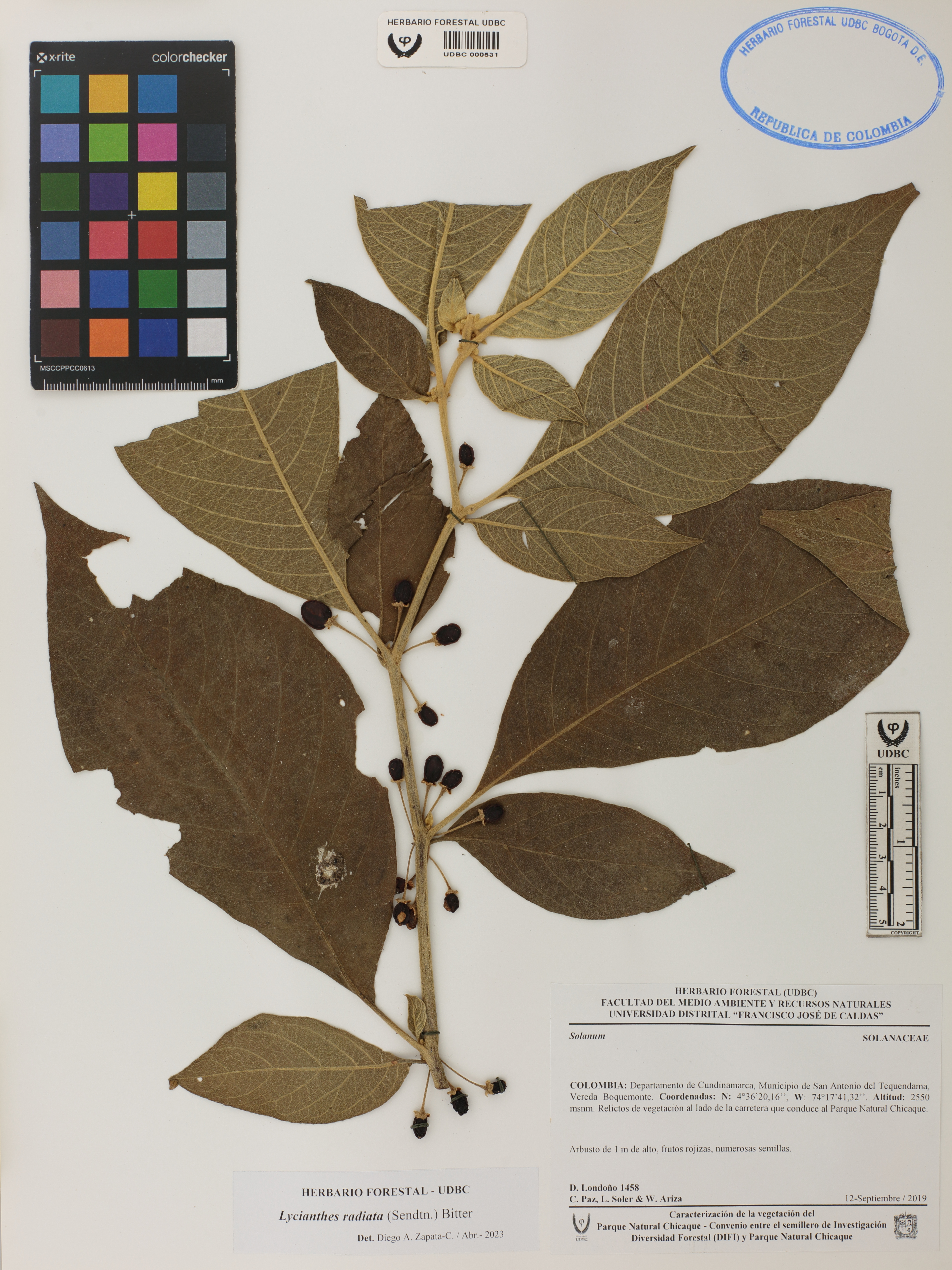 Fotografía del ejemplar Londoño, D. 1458, determinado como Lycianthes radiata en el año 2023