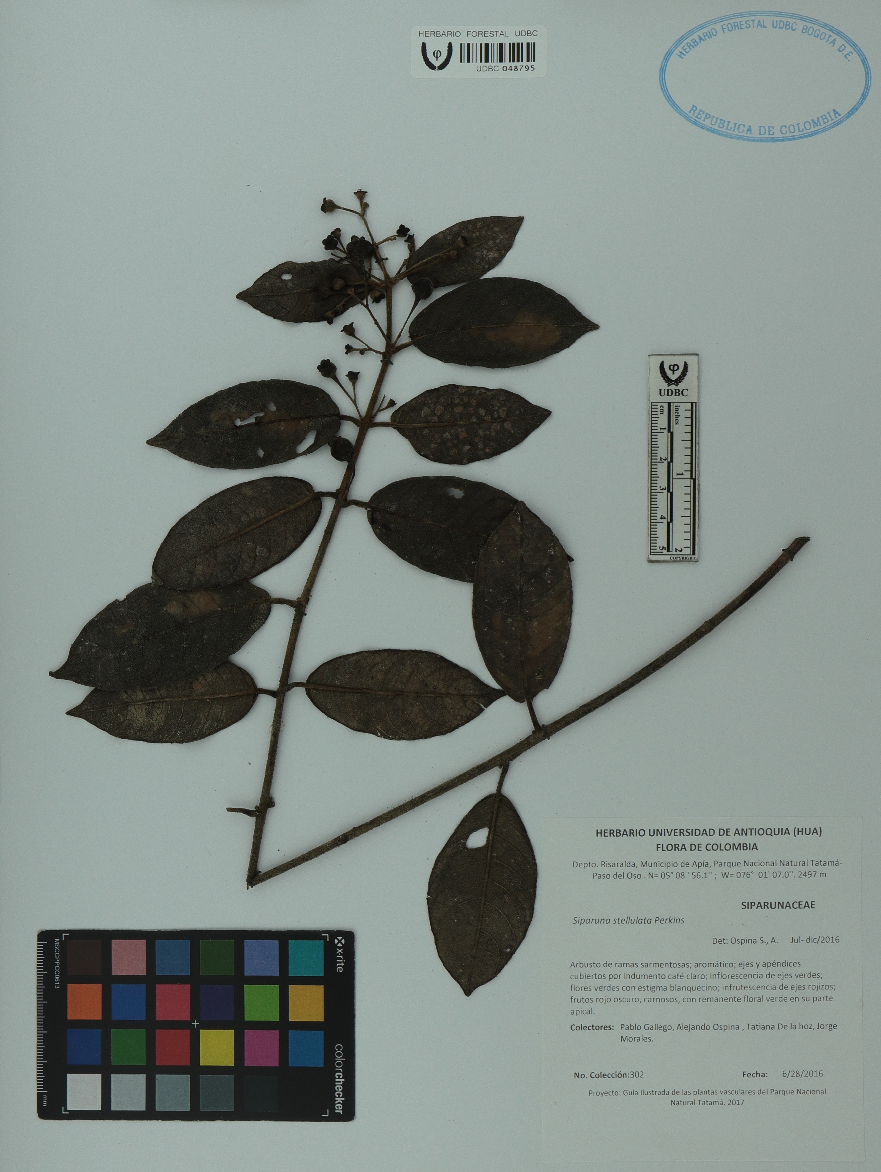 Fotografía del ejemplar Gallego, P. 302, determinado como Siparuna stellulata en el año 2016