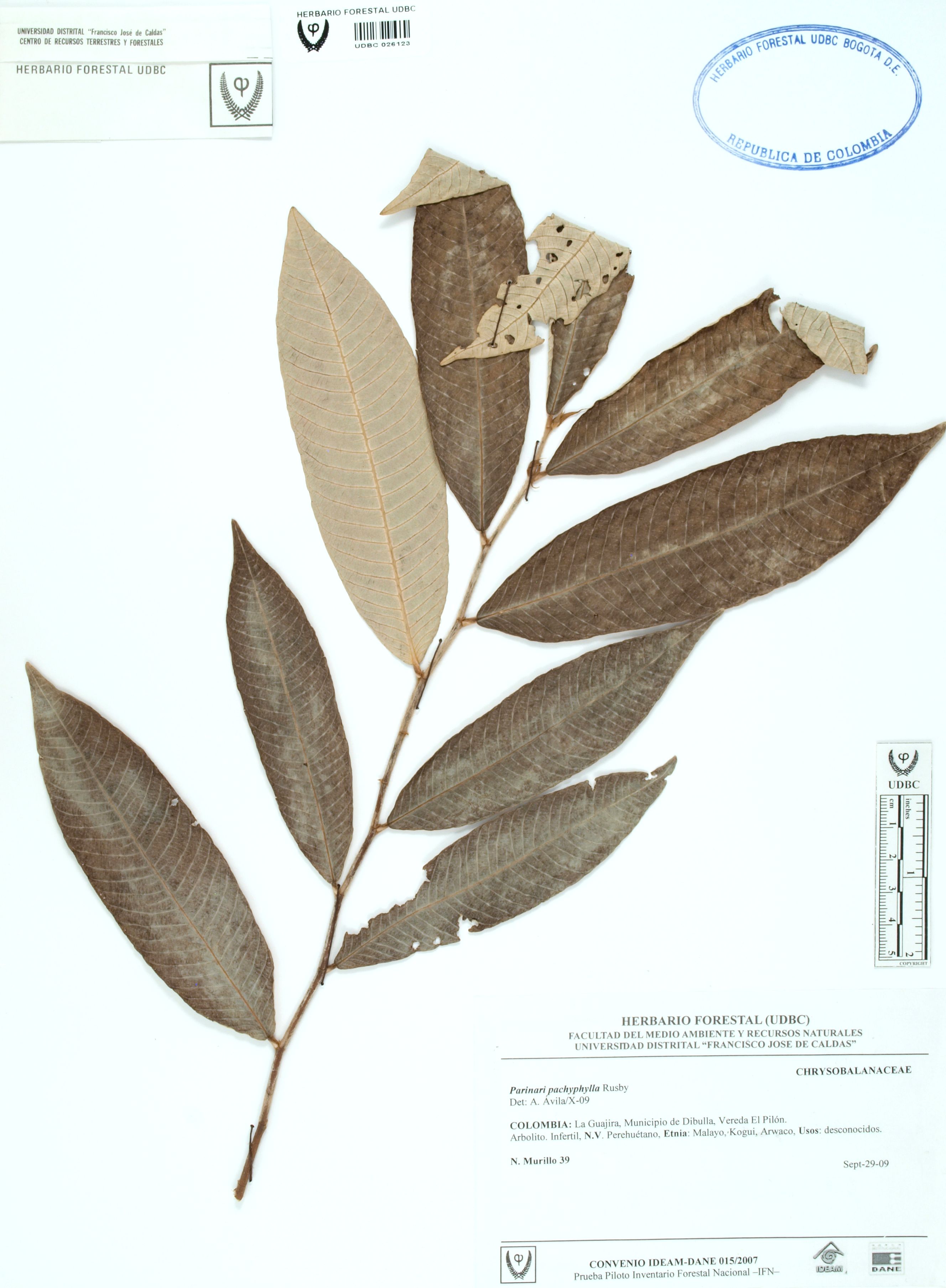 Fotografía del ejemplar Murillo, N. 39, determinado como Parinari pachyphylla en el año 2009