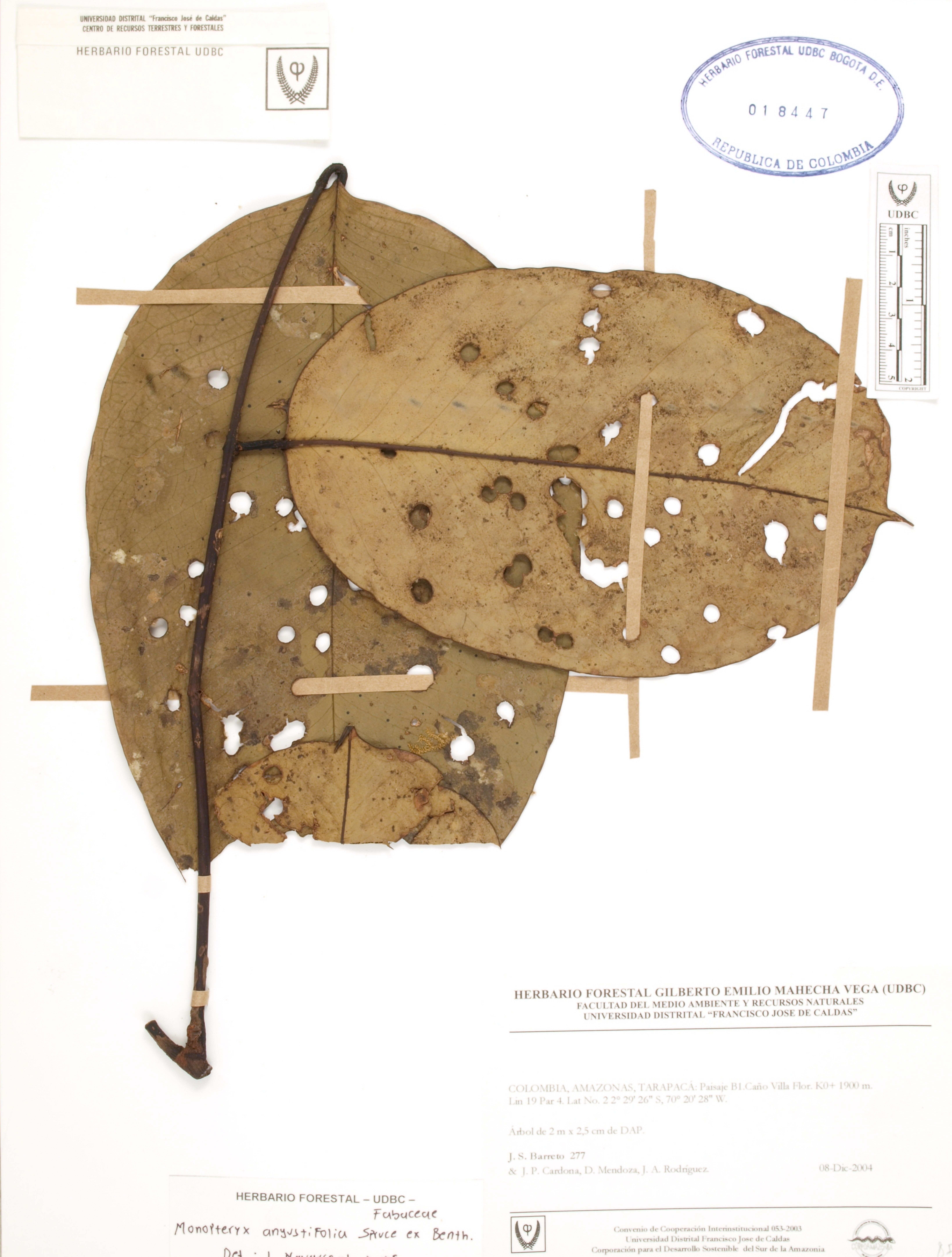 Fotografía del ejemplar Barreto, J. 277, determinado como Monopteryx angustifolia en el año 2005
