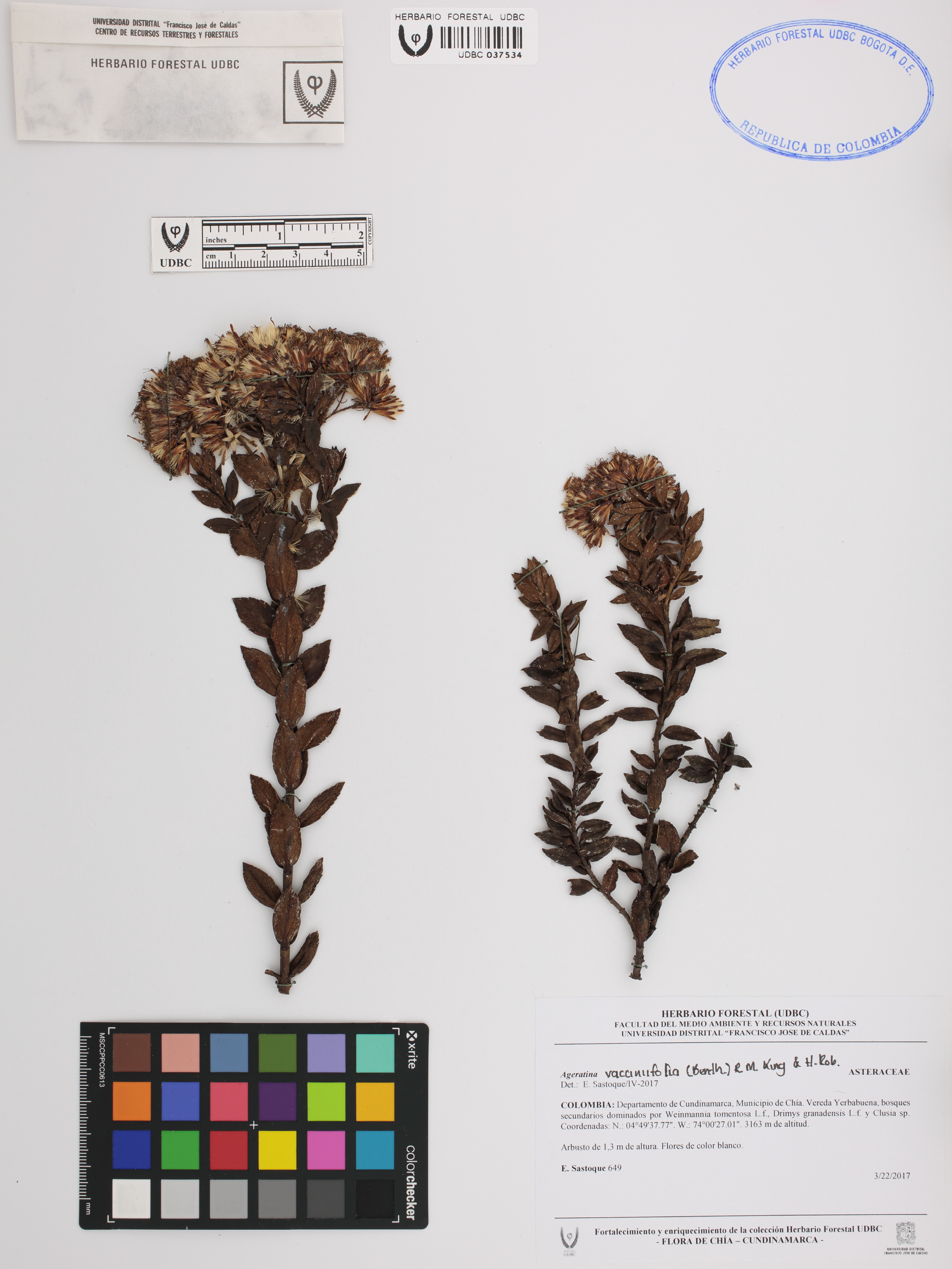 Fotografía del ejemplar Sastoque, E. 649, determinado como Ageratina vacciniifolia en el año 2017