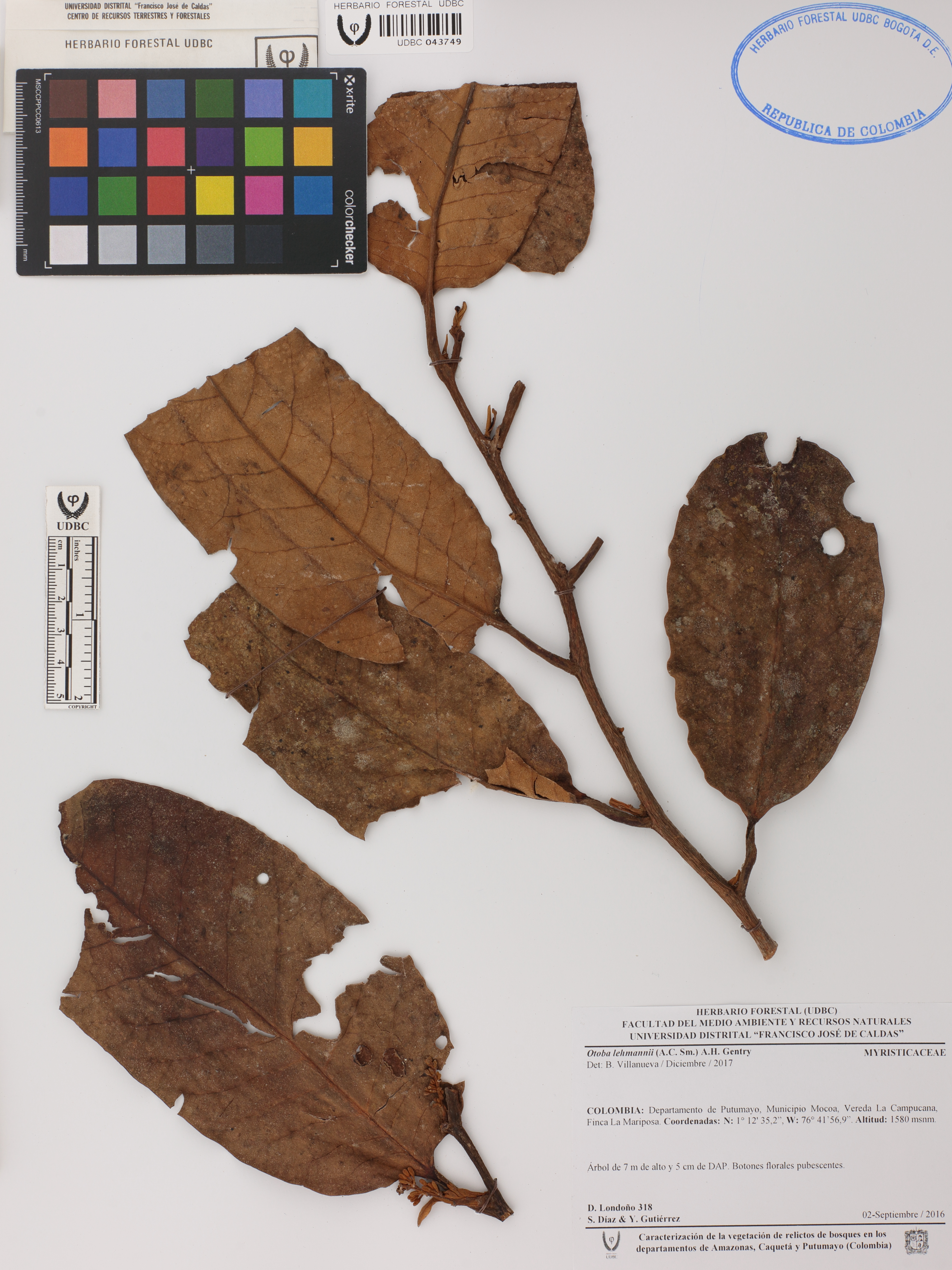 Fotografía del ejemplar Londoño, D. 318, determinado como Otoba lehmannii en el año 2017