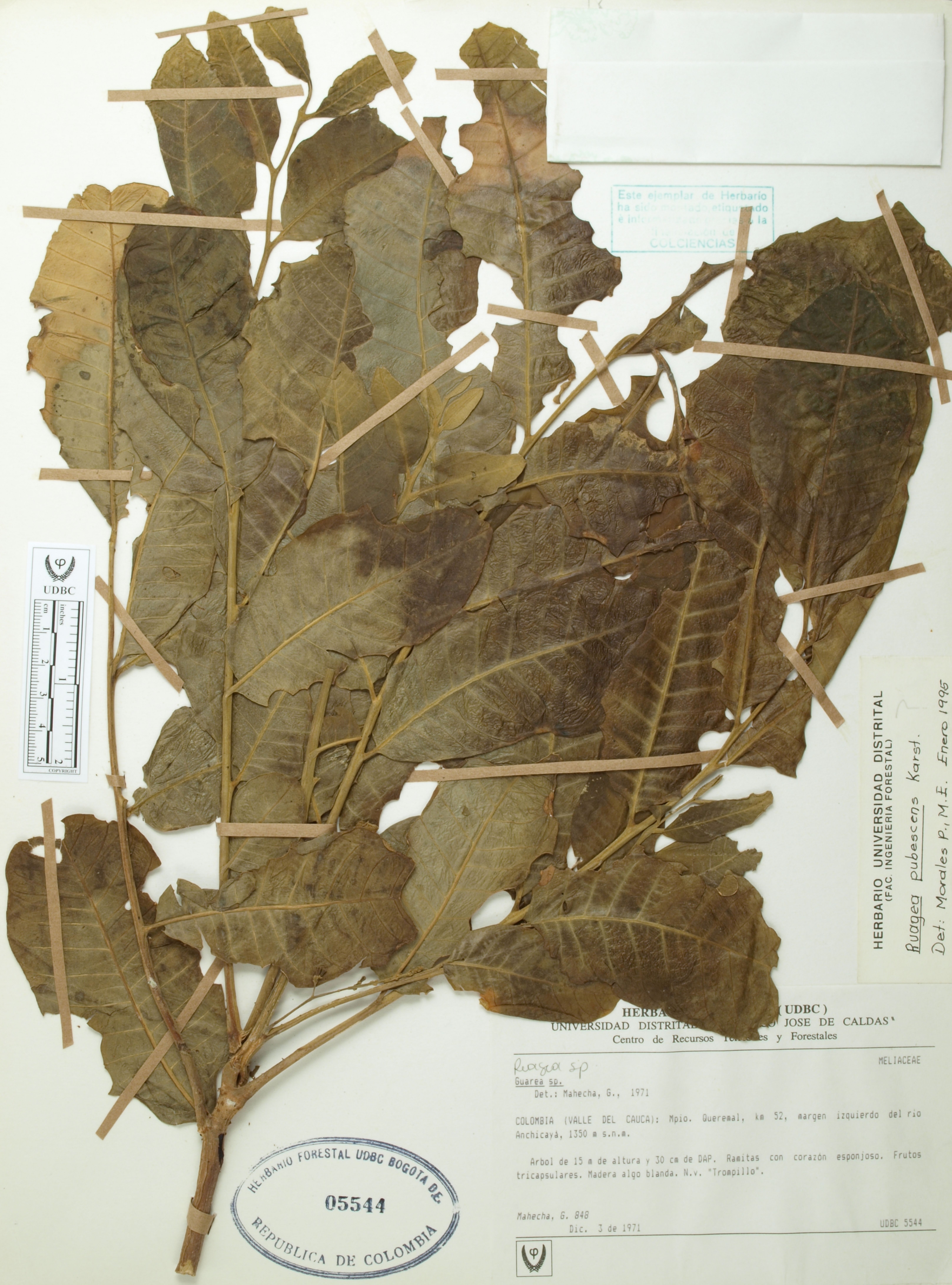Fotografía del ejemplar Mahecha, G. 848, determinado como Ruagea pubescens en el año 1995