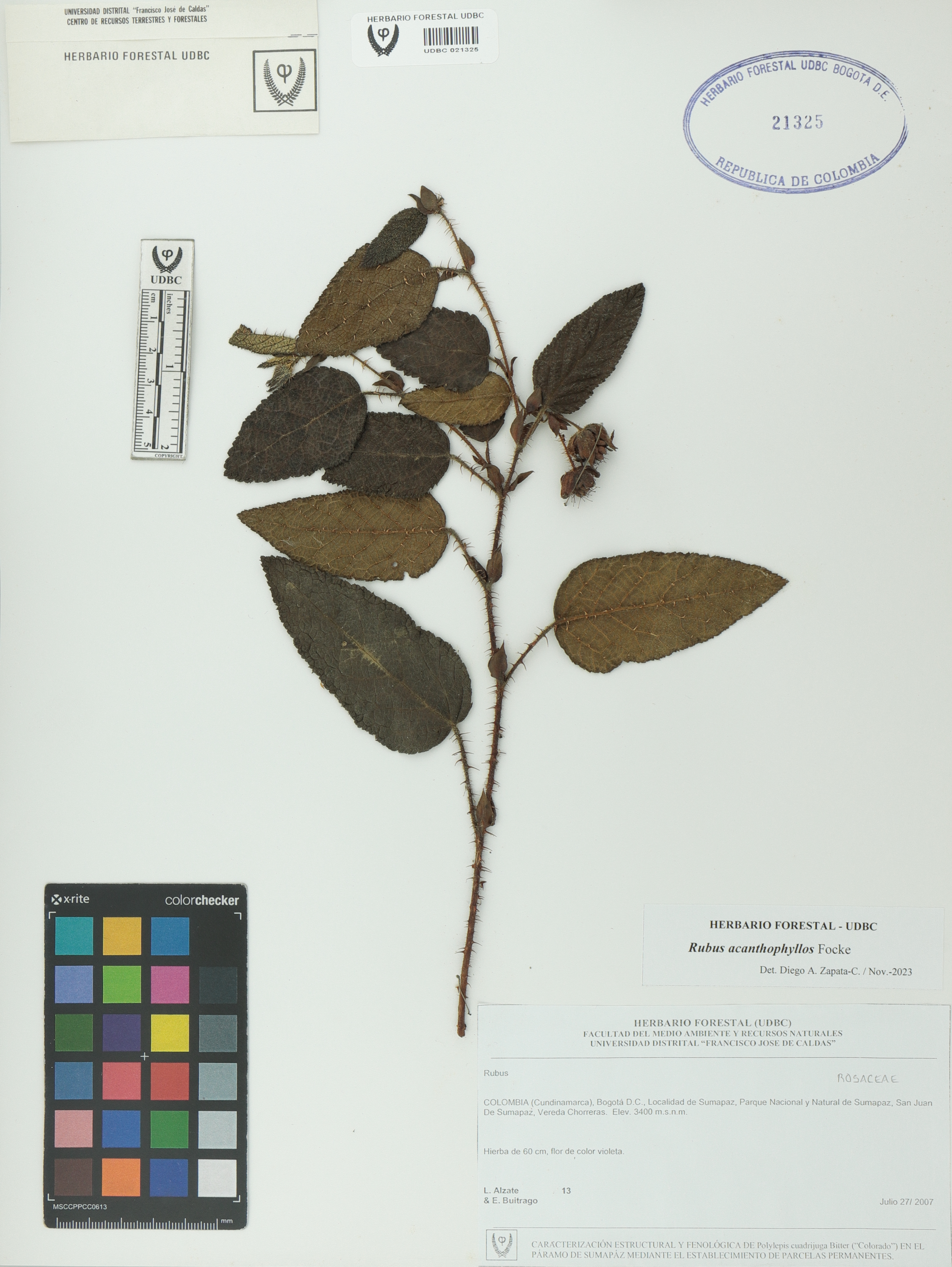Fotografía del ejemplar Alzate, L. 13, determinado como Rubus acanthophyllos en el año 2023