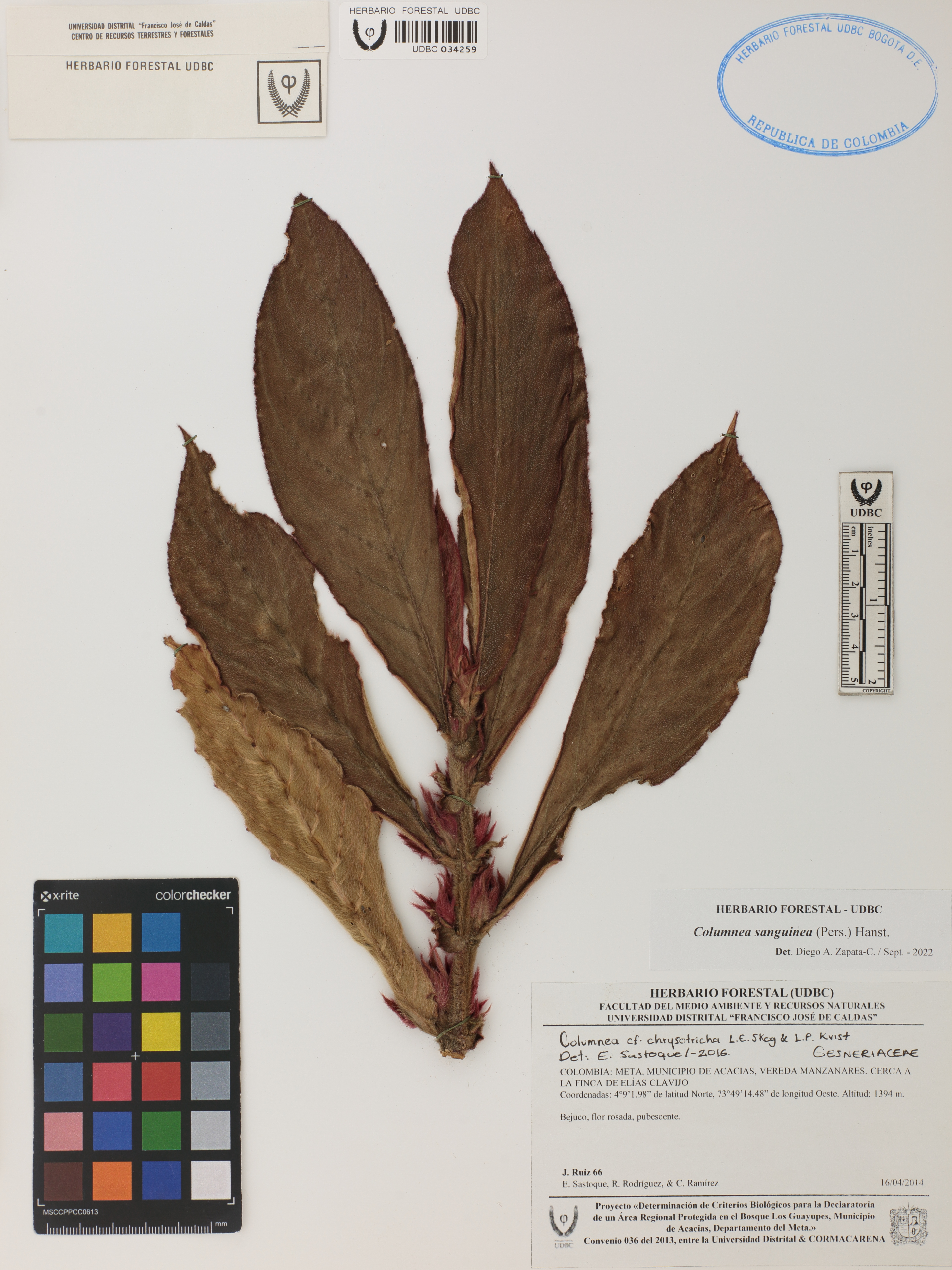Fotografía del ejemplar Ruiz, J. 66, determinado como Columnea sanguinea en el año 2022