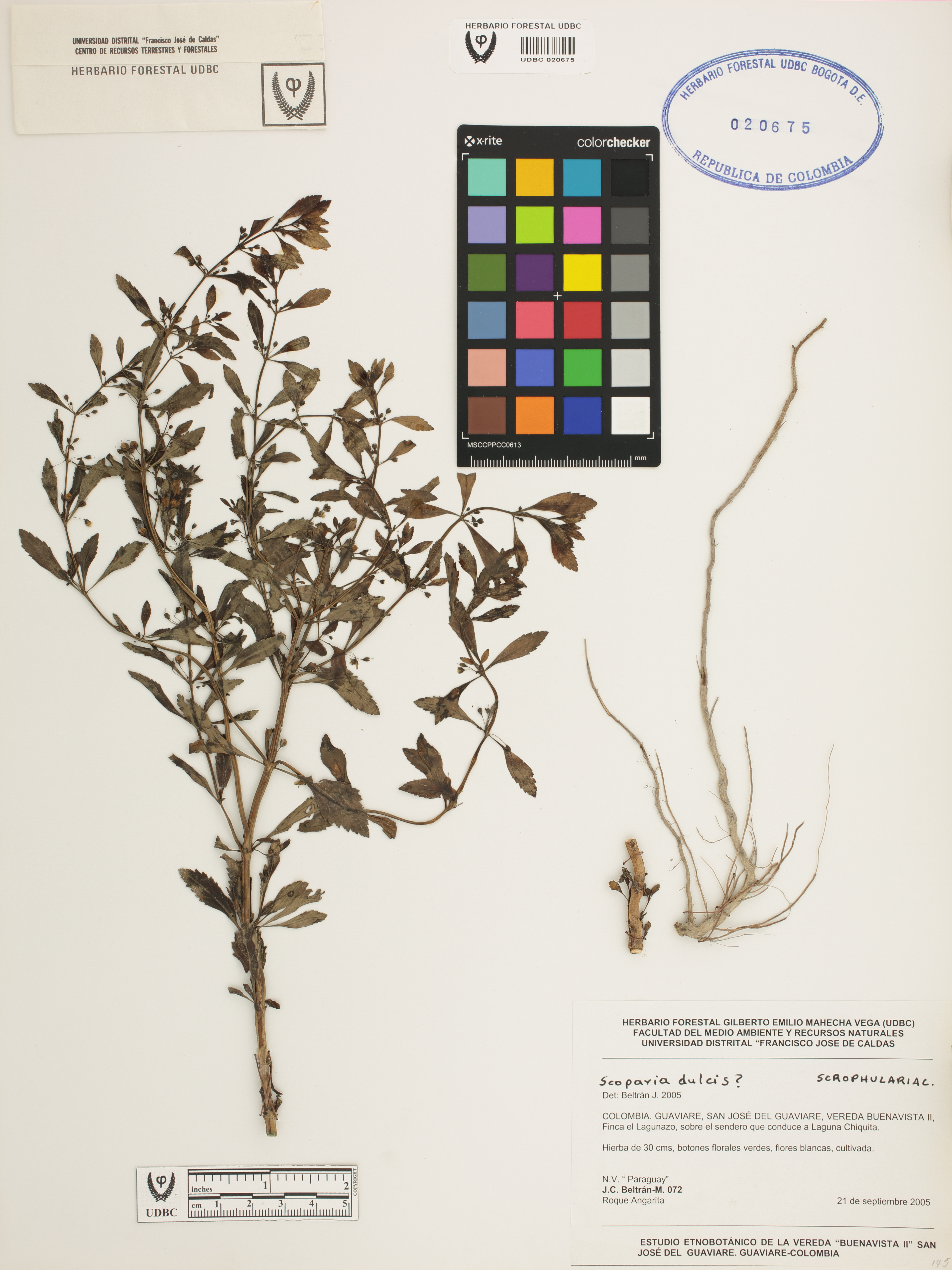 Fotografía del ejemplar Beltrán-M., J. 72, determinado como Scoparia dulcis en el año 2005