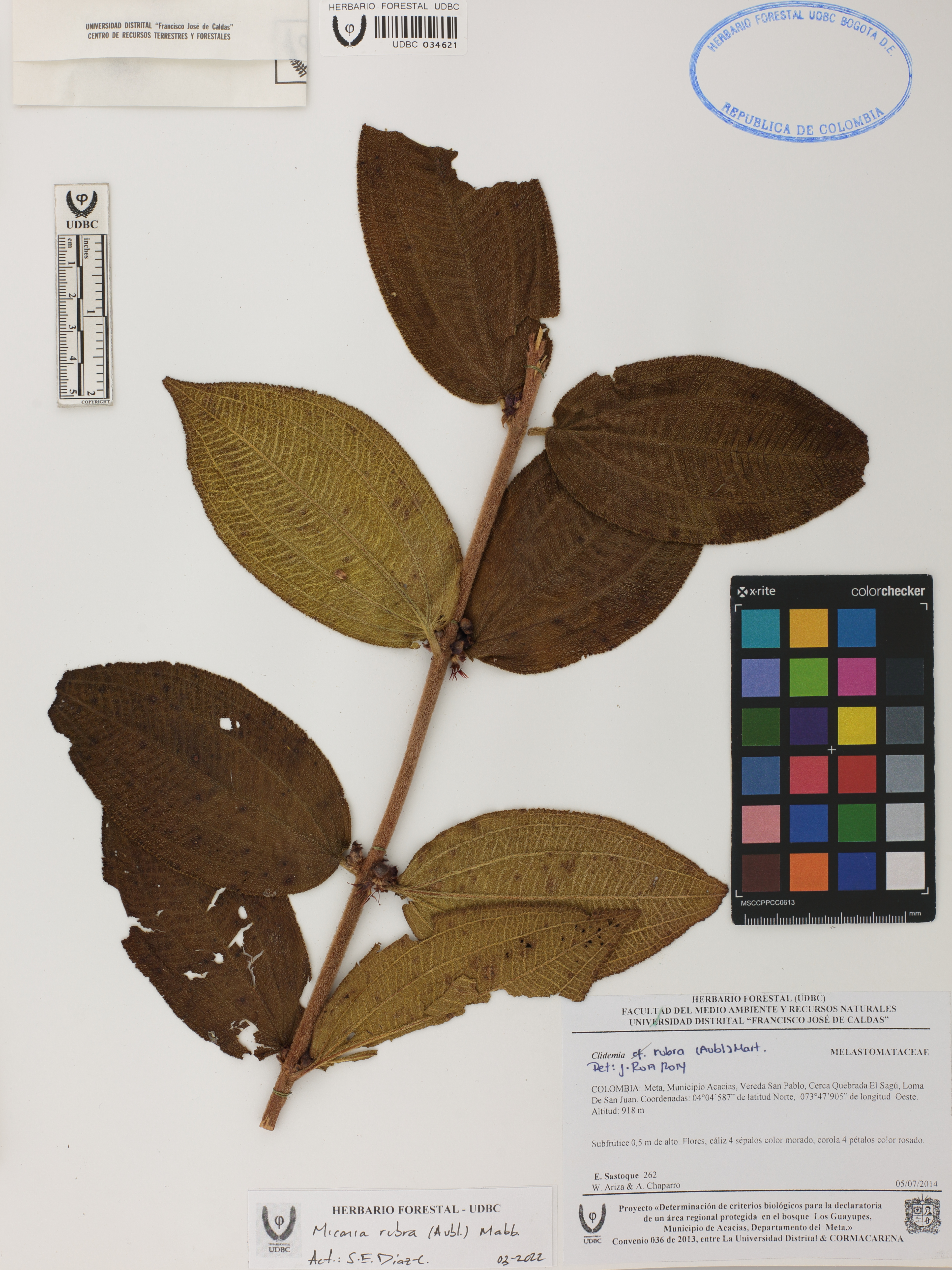 Fotografía del ejemplar Sastoque, E. 262, determinado como Miconia rubra en el año 2014