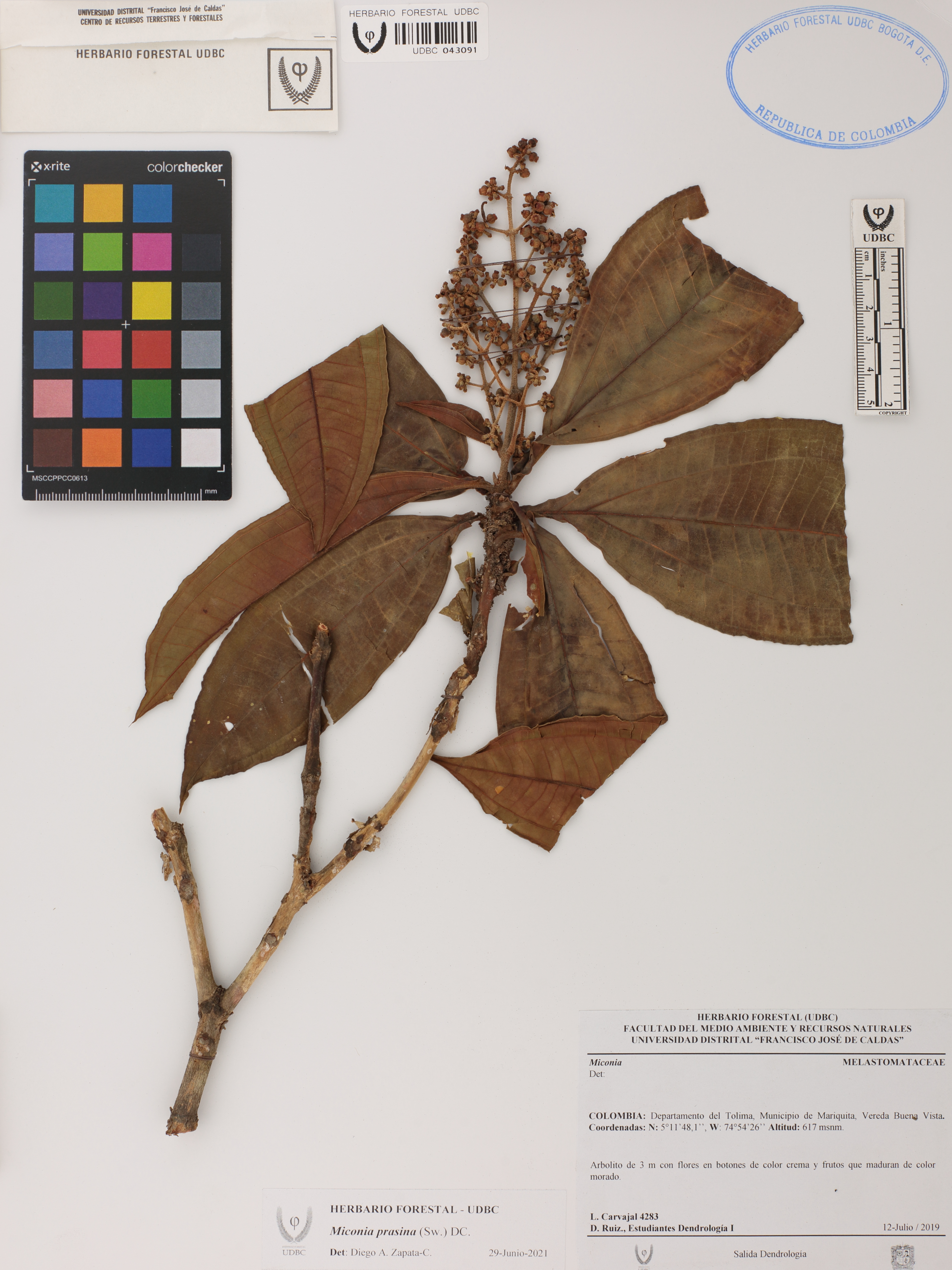Fotografía del ejemplar Carvajal, L. 4283, determinado como Miconia prasina en el año 2021
