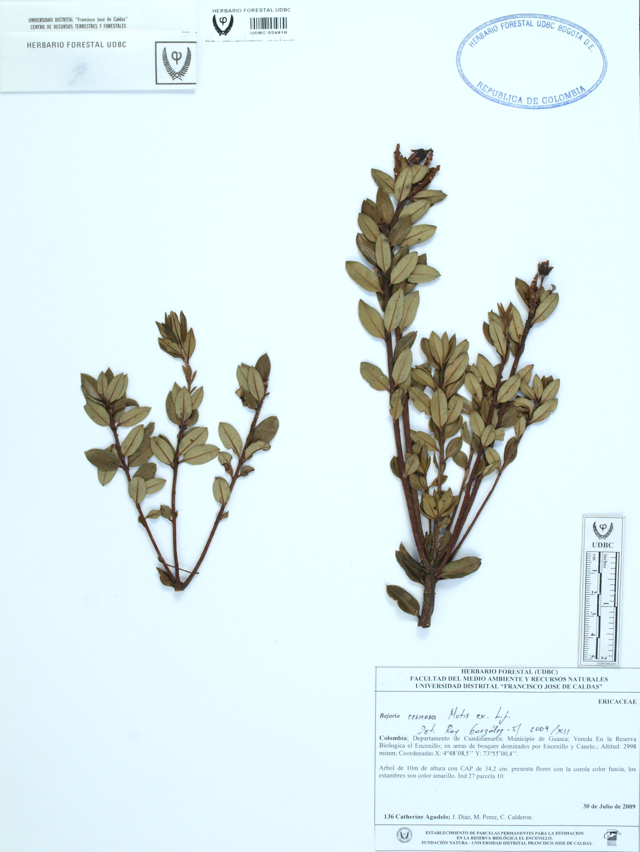 | dc.description | Fotografía del ejemplar Agudelo, C. 136, determinado como Bejaria resinosa en el año 2009 | |