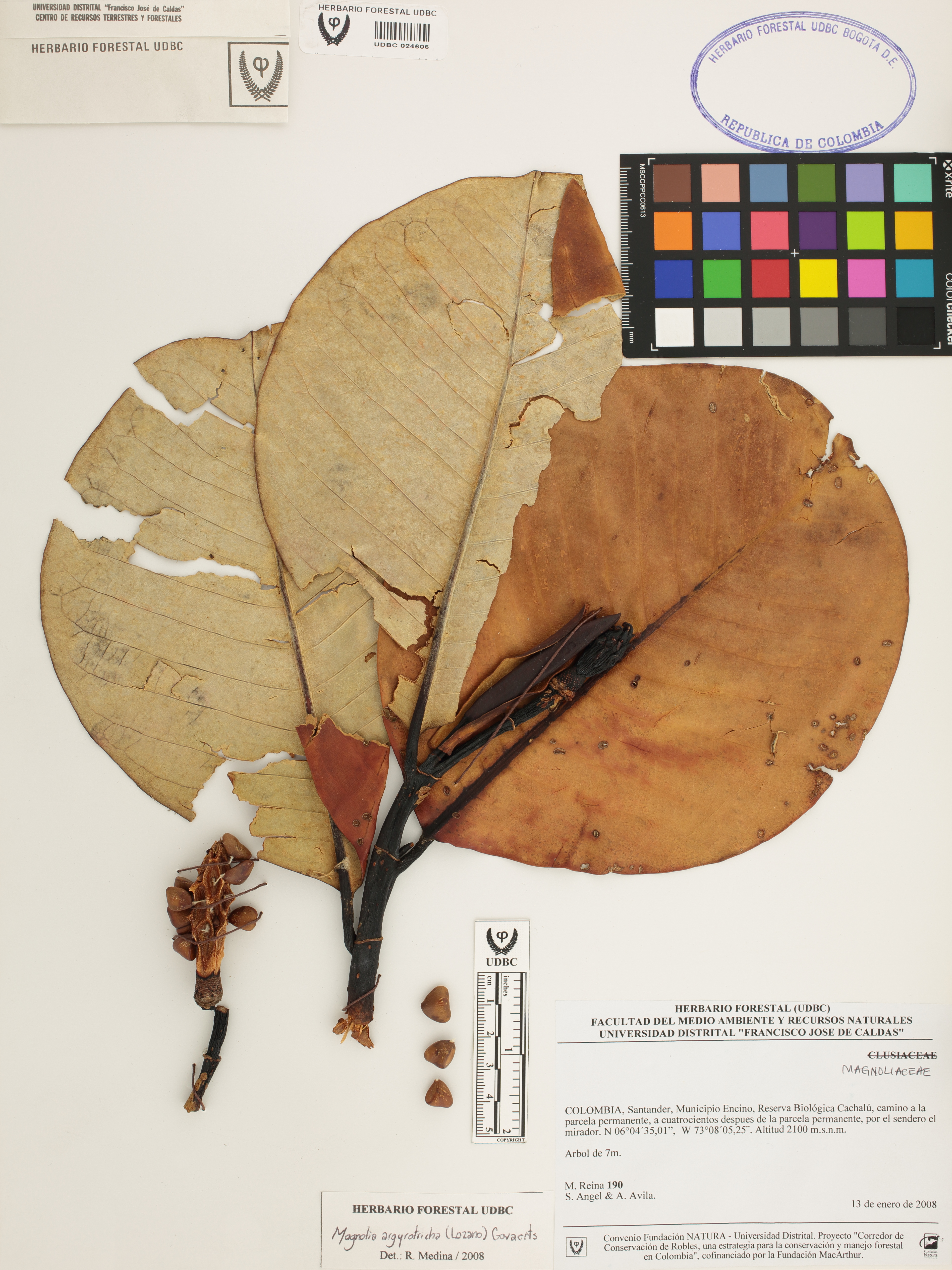 Fotografía del ejemplar Reina, M. 190, determinado como Magnolia argyrothricha en el año 2008