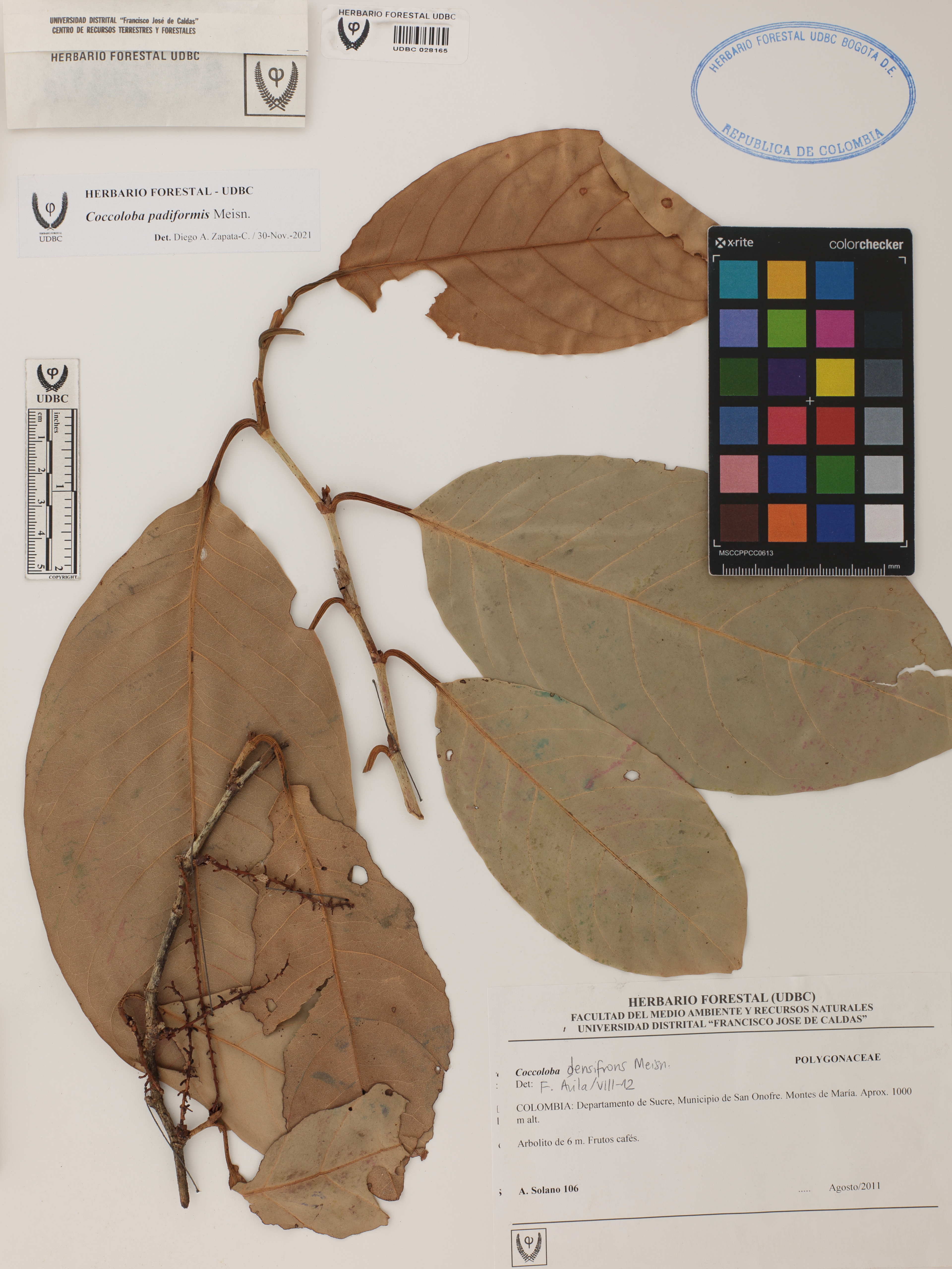 Fotografía del ejemplar Solano, A. 106, determinado como Coccoloba padiformis en el año 2021