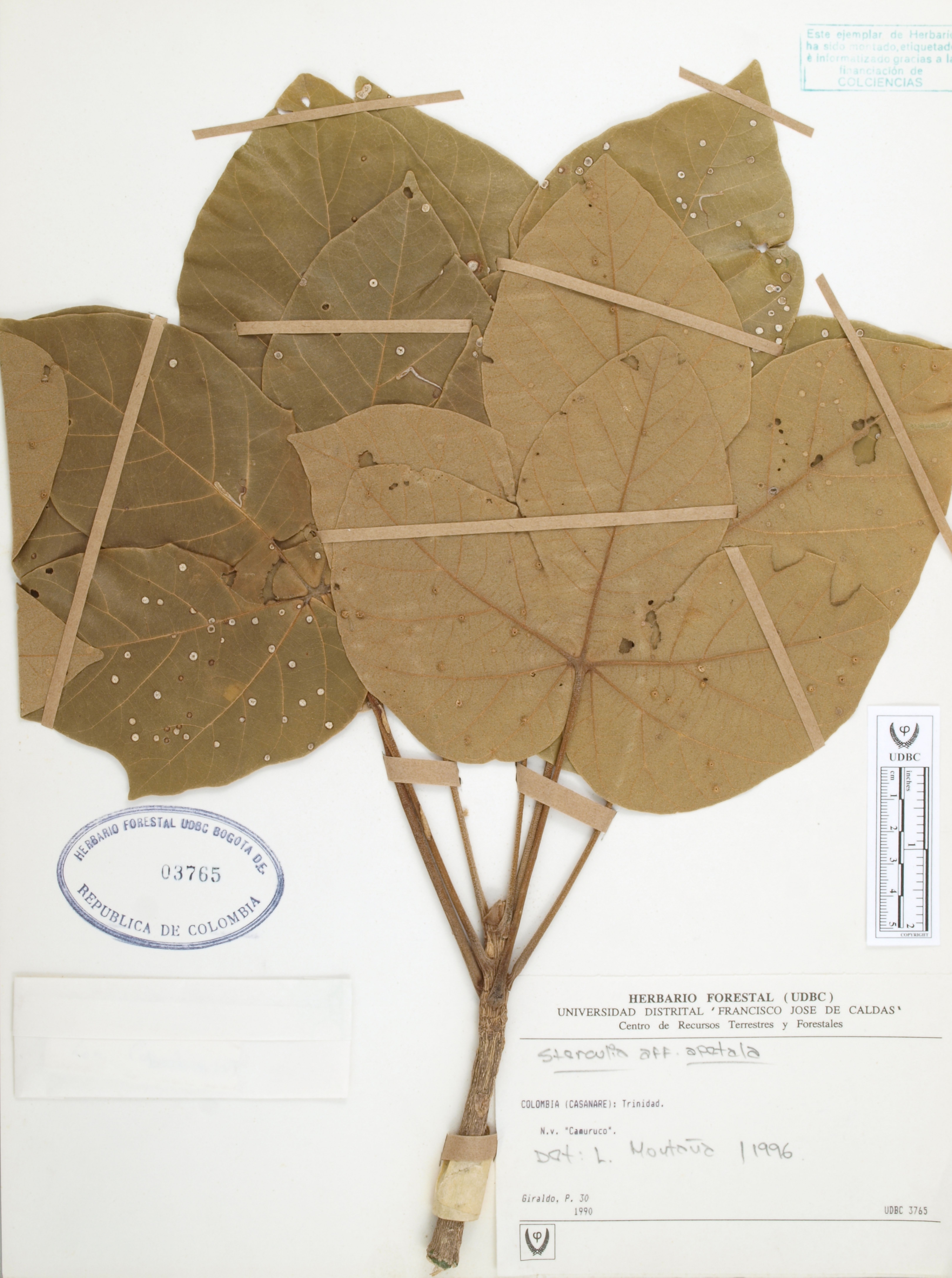 Fotografía del ejemplar Giraldo, P. 304, determinado como Sterculia apetala en el año 1996