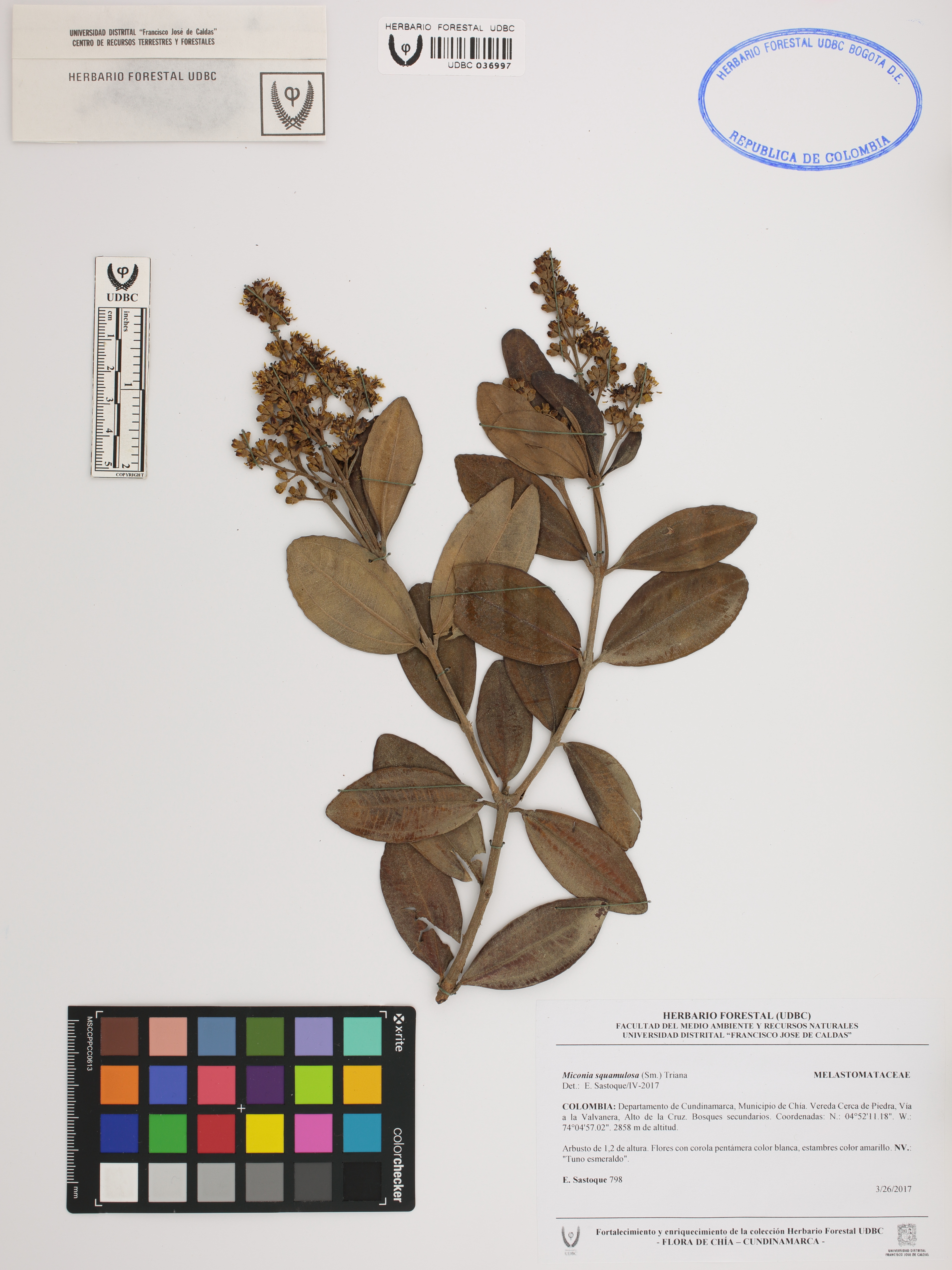 Fotografía del ejemplar Sastoque, E. 798, determinado como Miconia squamulosa en el año 2017