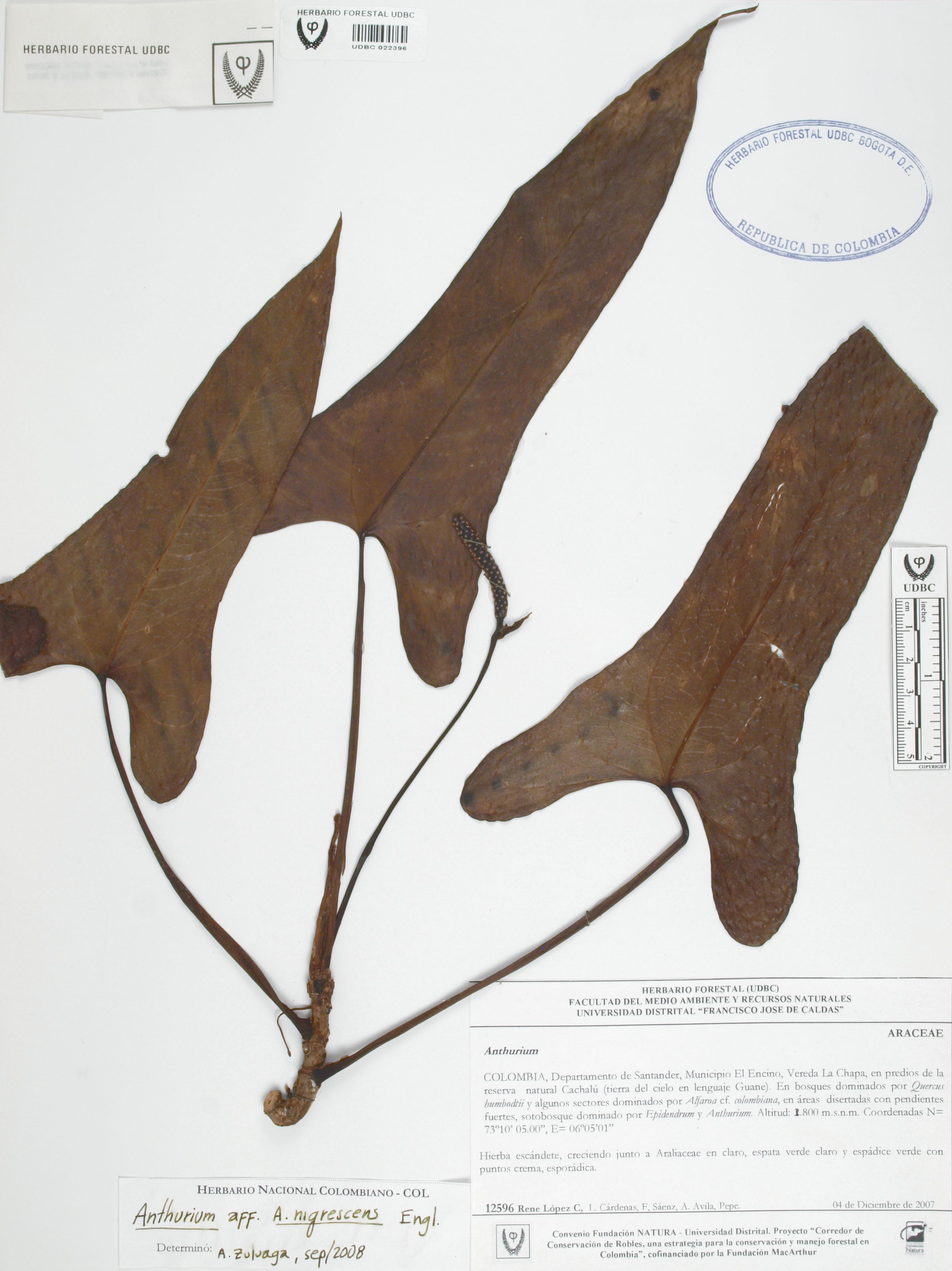 Fotografía del ejemplar López, R. 12596, determinado como Anthurium nigrescens en el año 2008
