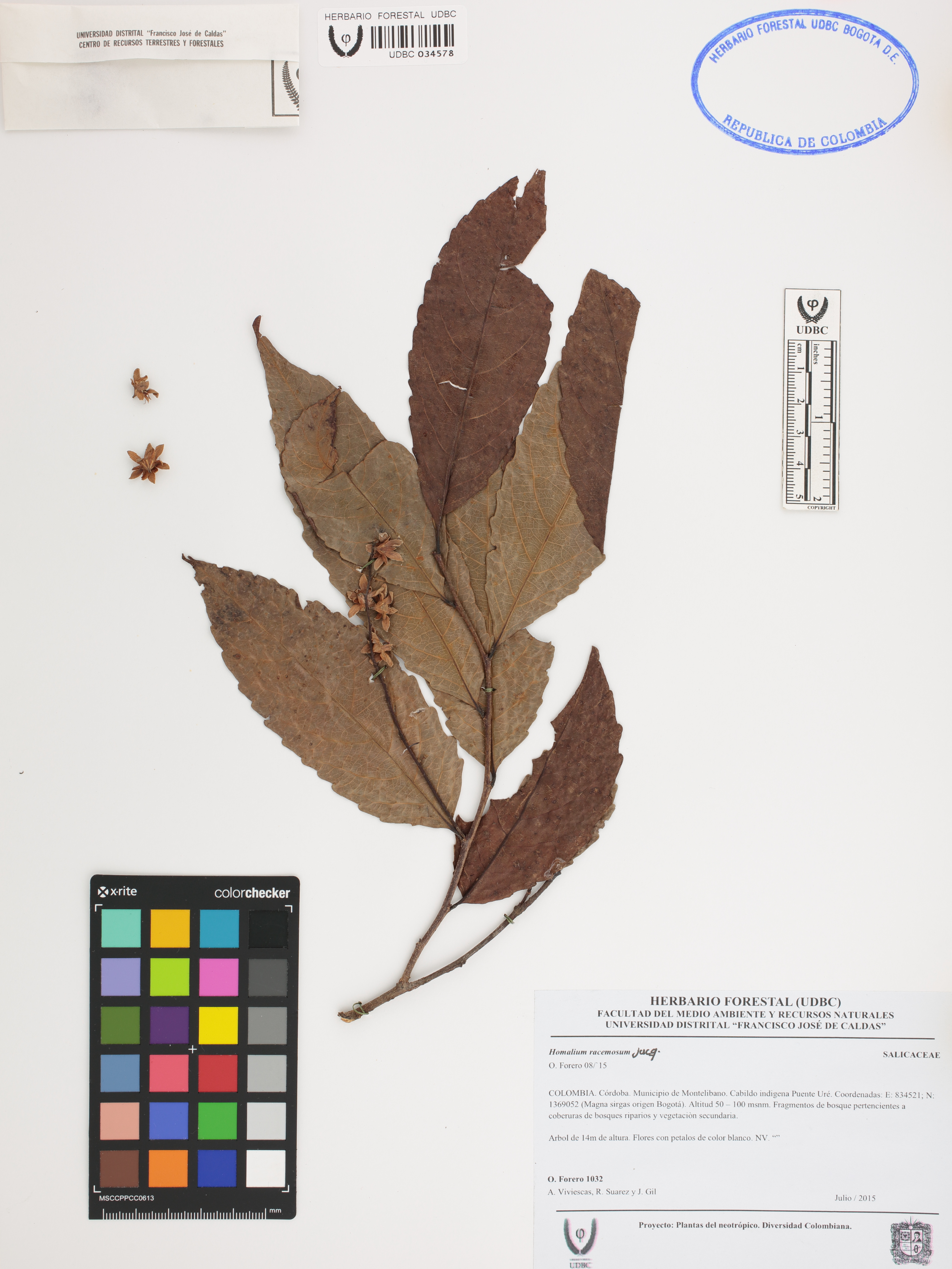 Fotografía del ejemplar Forero, O. 1032, determinado como Homalium racemosum en el año 2015