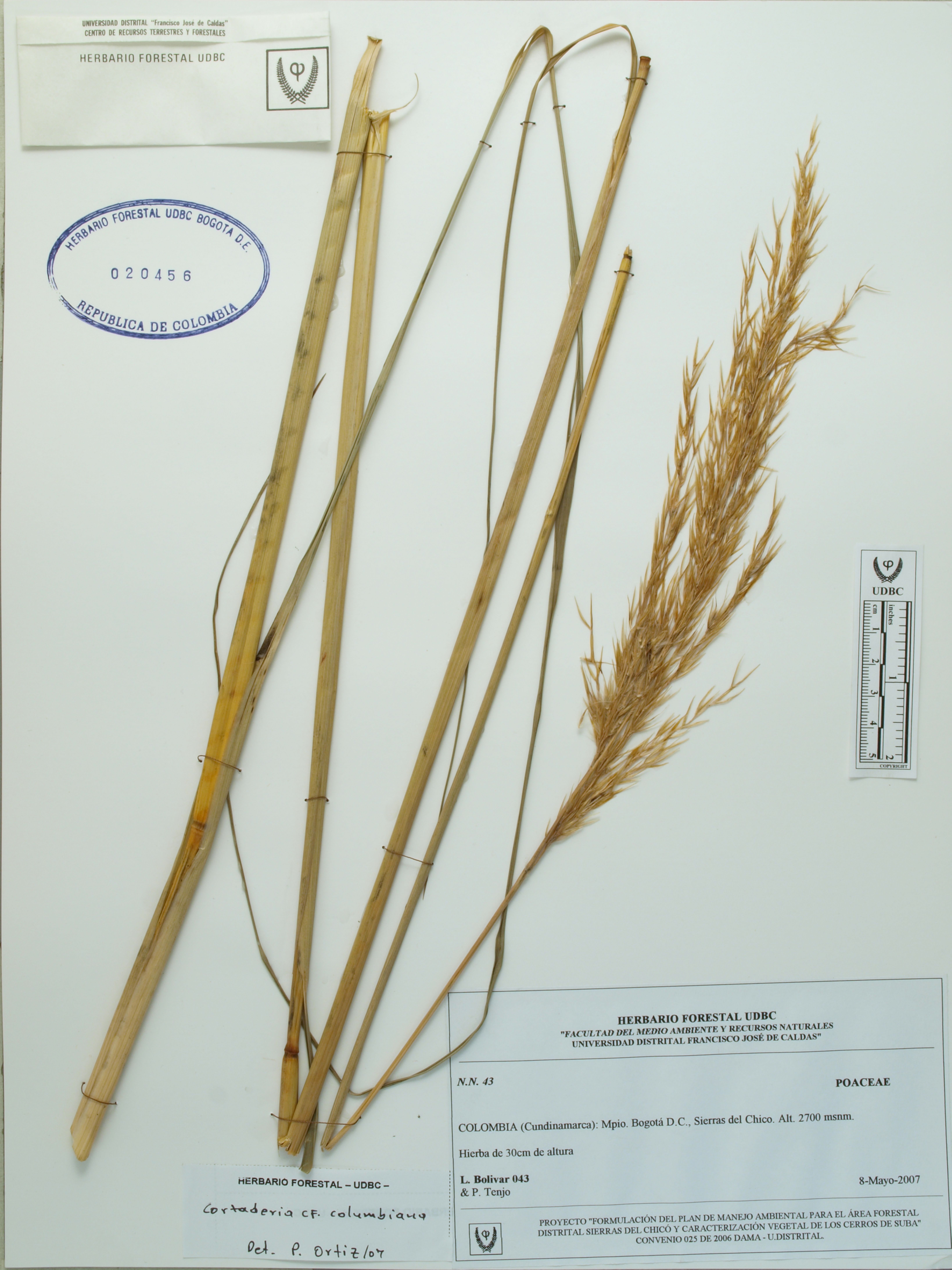 Fotografía del ejemplar Bolívar, L. 43, determinado como Cortaderia columbiana en el año 2007