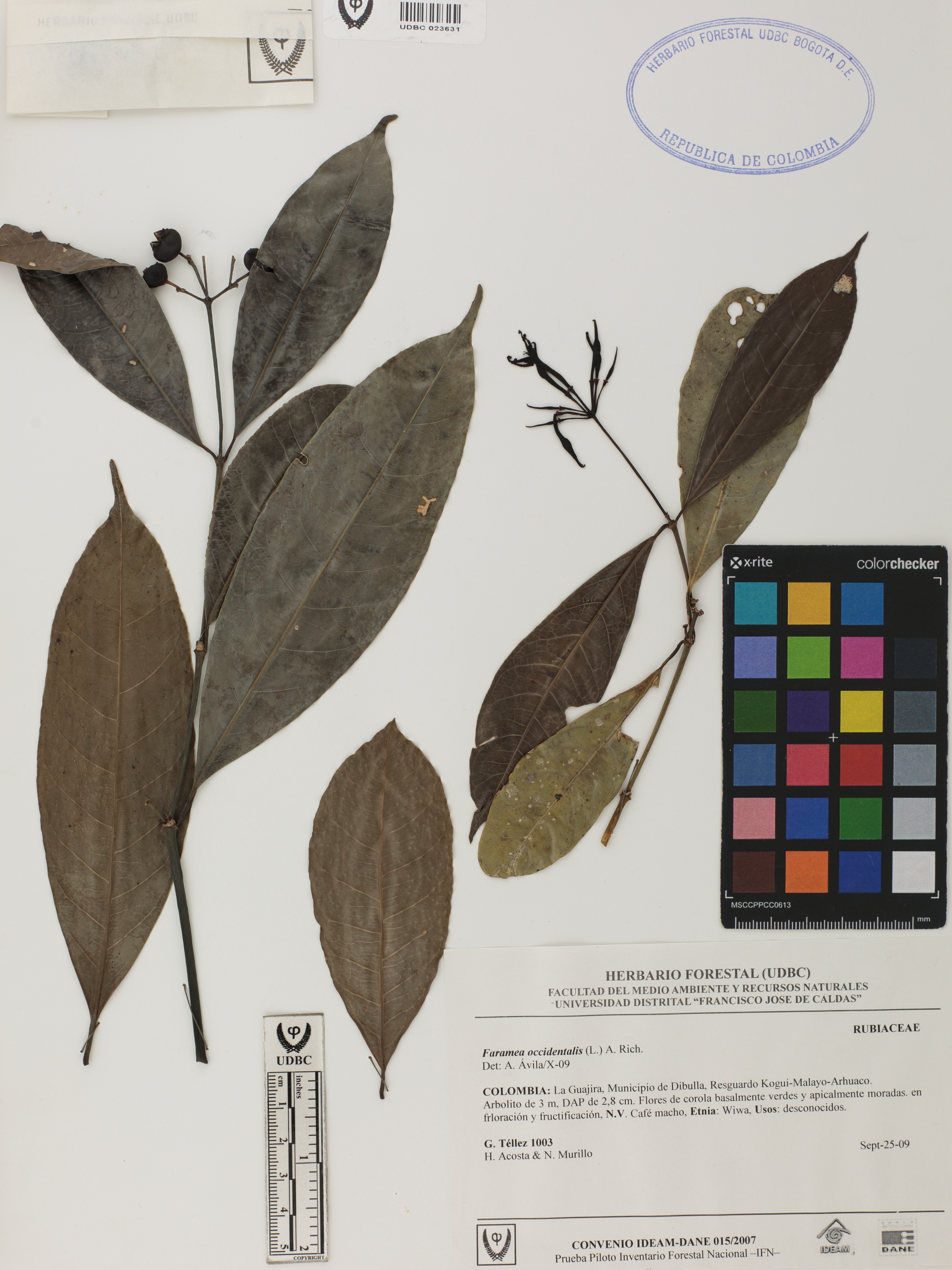 Fotografía del ejemplar Téllez, G. 1003, determinado como Faramea occidentalis en el año 2009