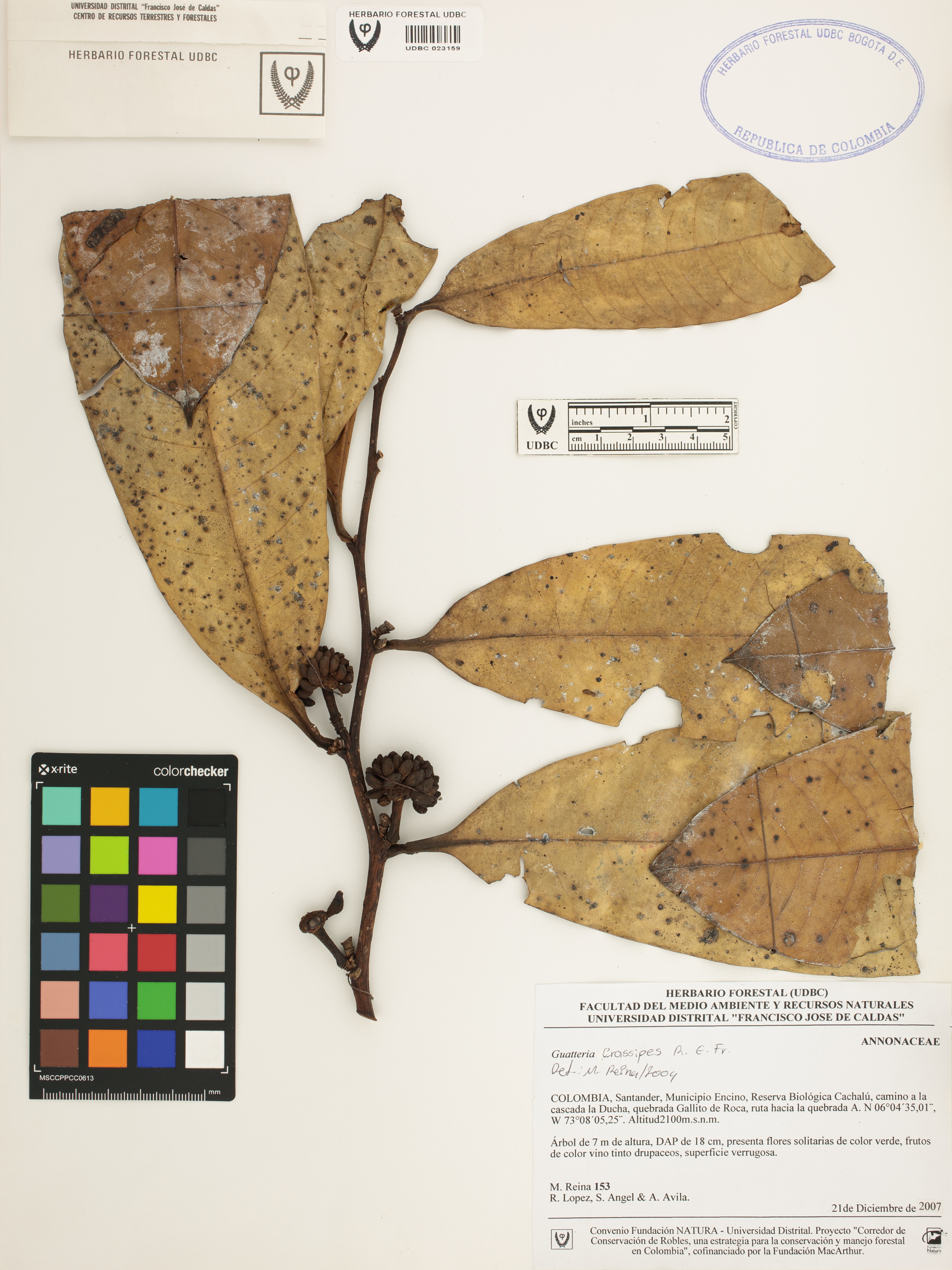 Fotografía del ejemplar Reina, M. 153, determinado como Guatteria crassipes en el año 2009