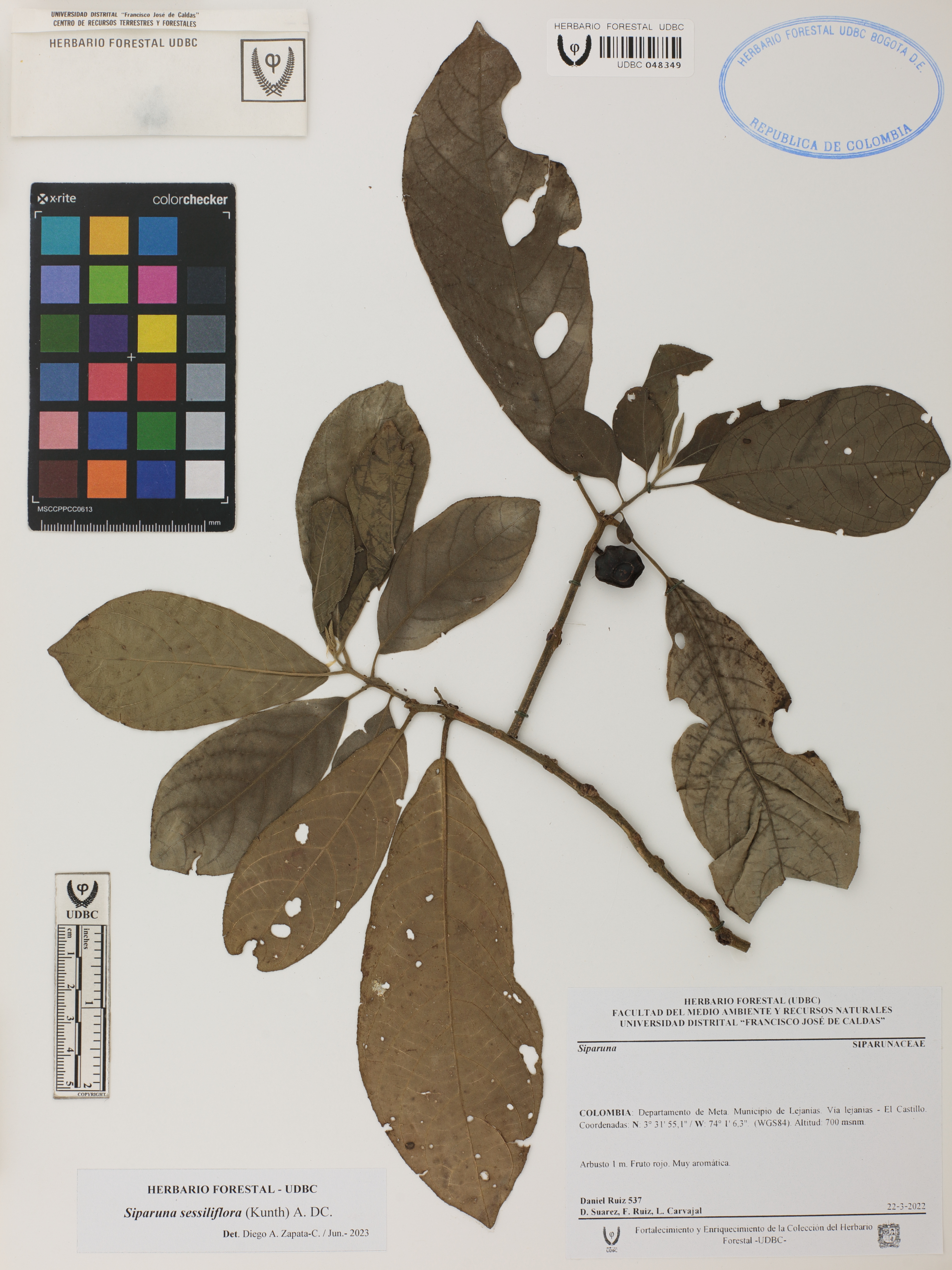 Fotografía del ejemplar Ruiz, Daniel 537, determinado como Siparuna sessiliflora en el año 2023