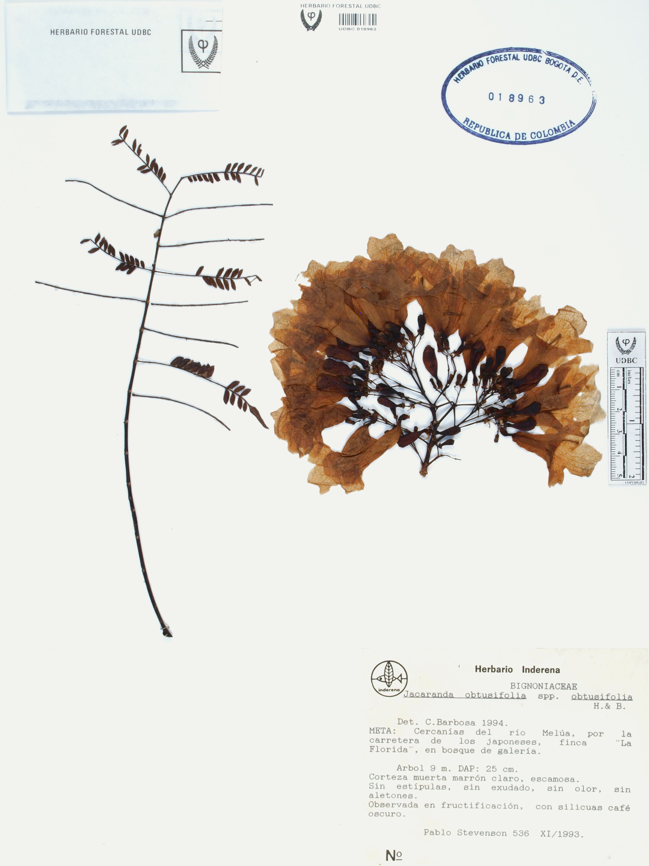 Fotografía del ejemplar Stevenson, P. 536, determinado como Jacaranda obtusifolia en el año 1994