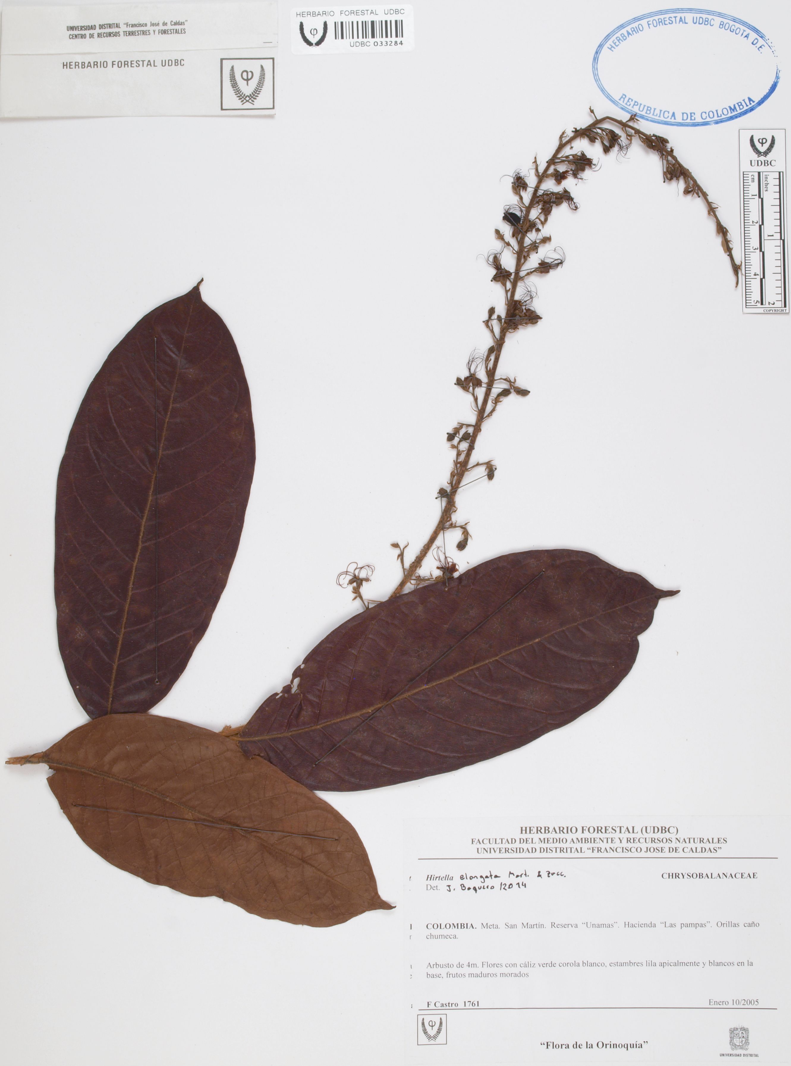 Fotografía del ejemplar Castro, F. 1761, determinado como Hirtella elongata en el año 2014