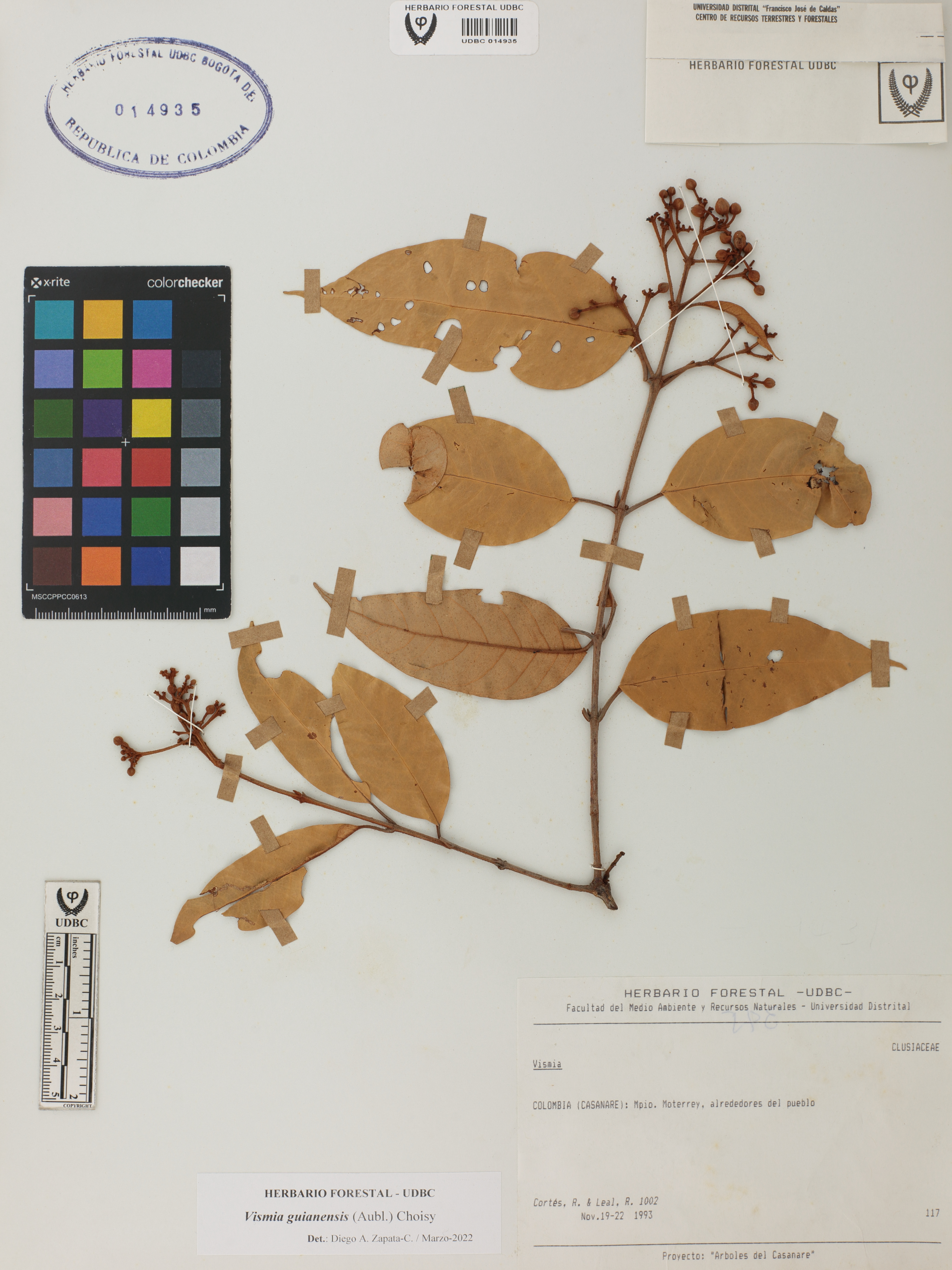 Fotografía del ejemplar Cortés-B., R. 1002, determinado como Vismia guianensis en el año 2022