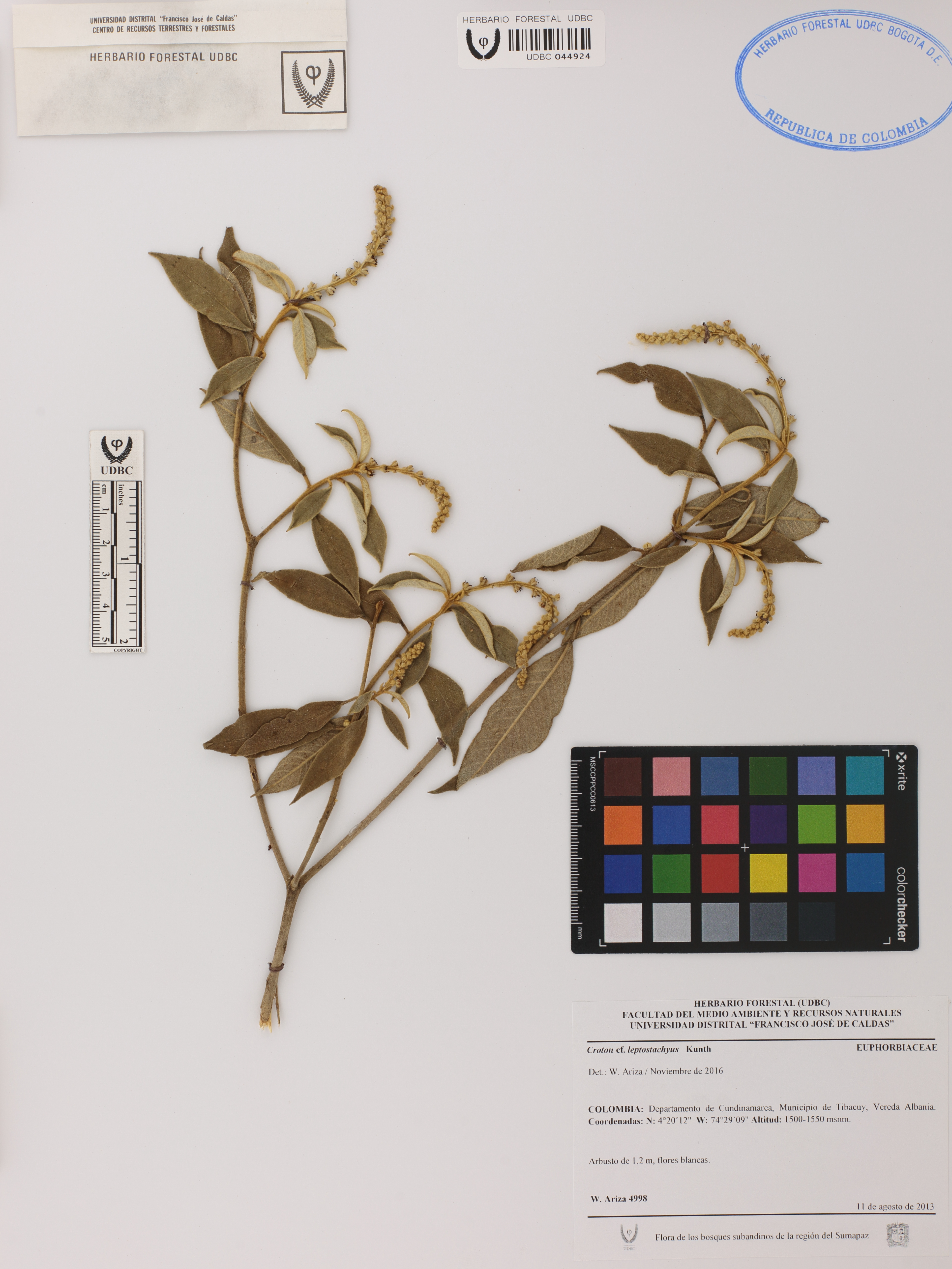 | dc.description | Fotografía del ejemplar Ariza-Cortés, W. 4998, determinado como Croton leptostachyus en el año 2016 | |