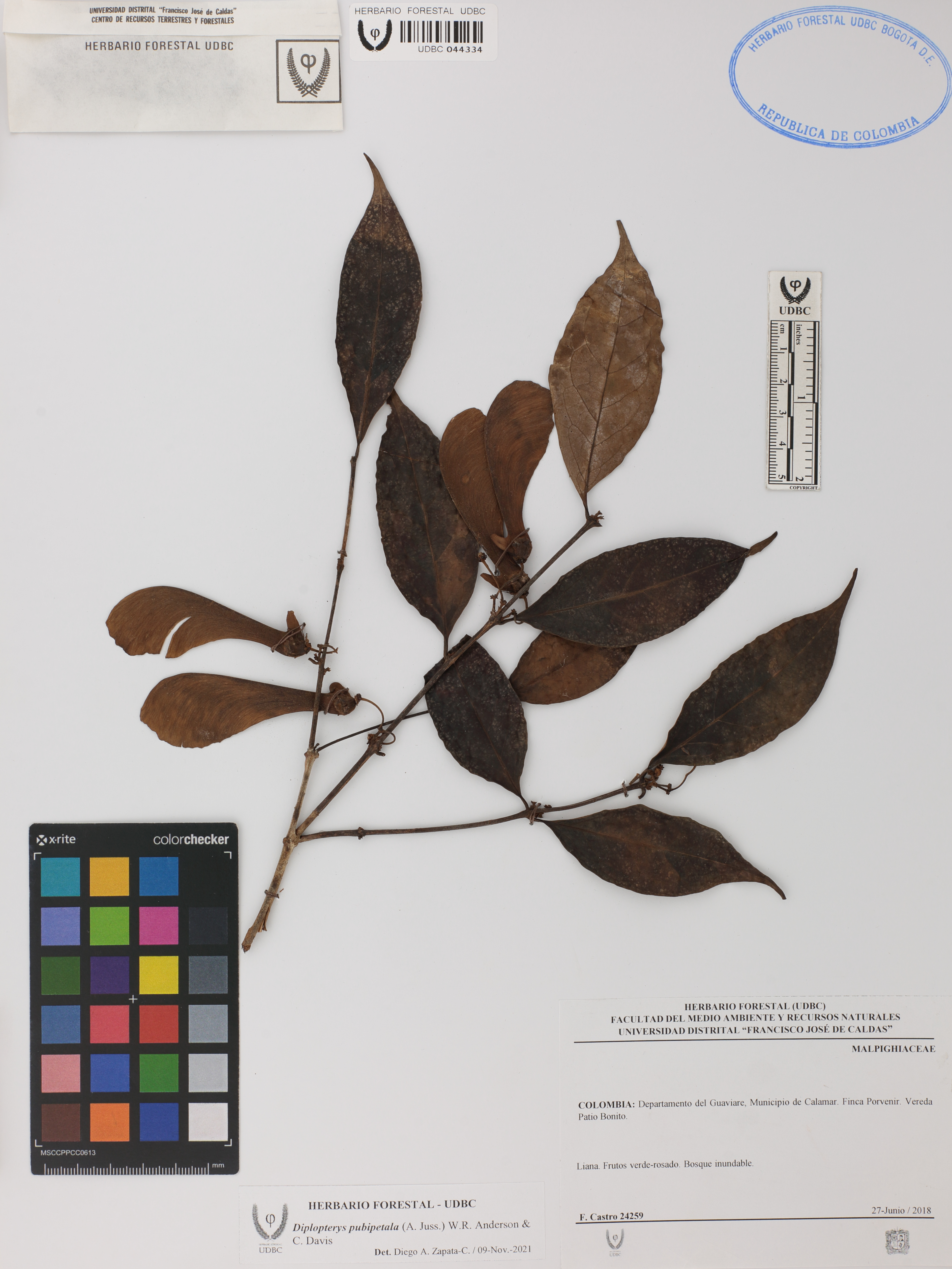 Fotografía del ejemplar Castro, F. 24259, determinado como Diplopterys pubipetala en el año 2021