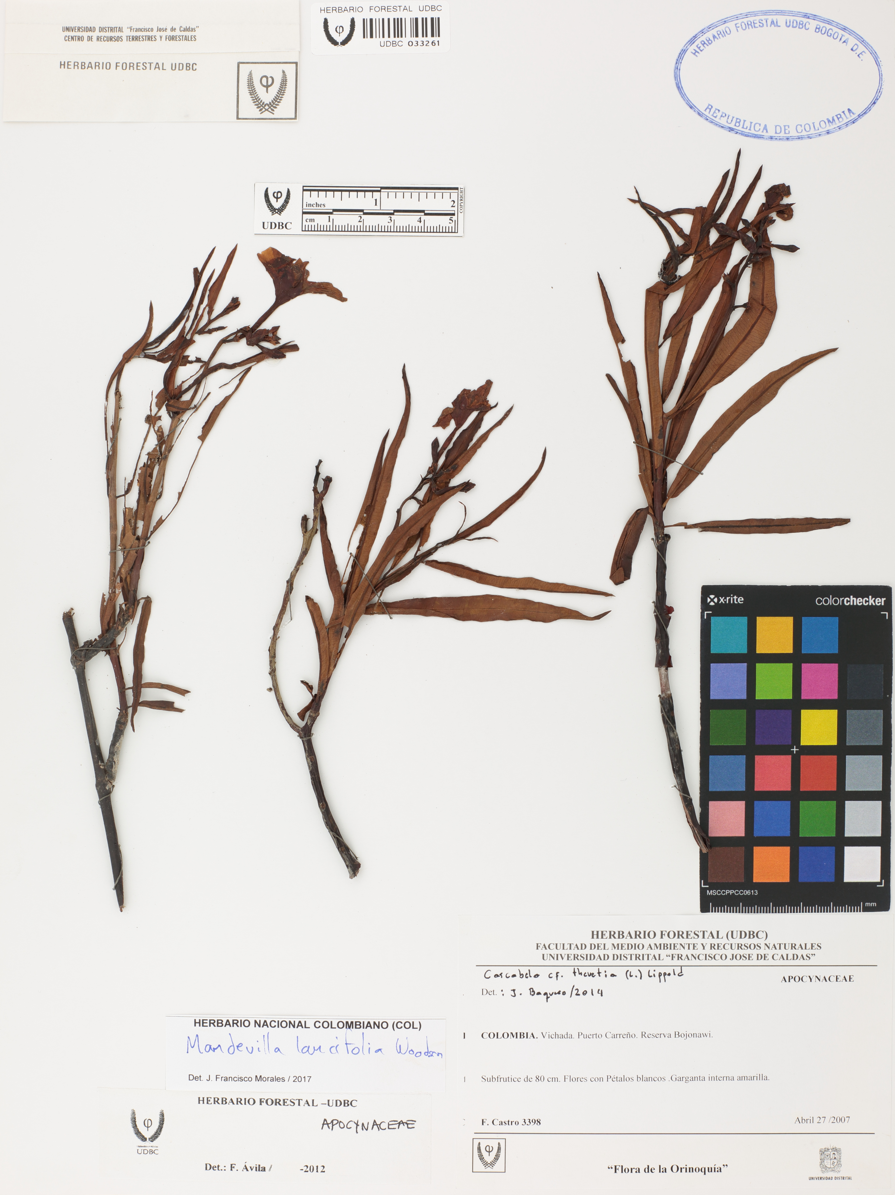 Fotografía del ejemplar Castro, F. 3398, determinado como Mandevilla lancifolia en el año 2017