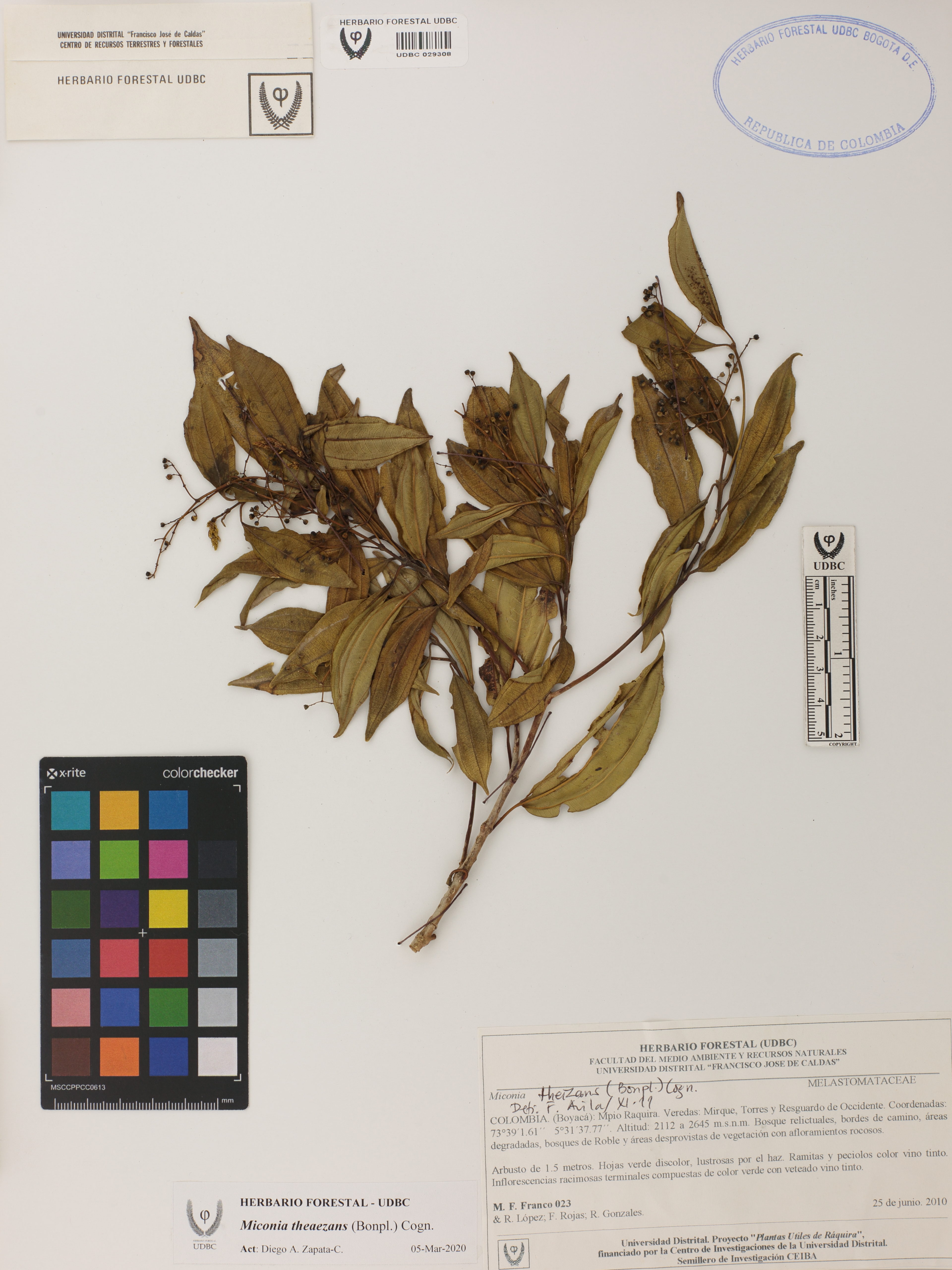 | dc.description | Fotografía del ejemplar Franco, M. 23, determinado como Miconia theaezans en el año 2011 | |