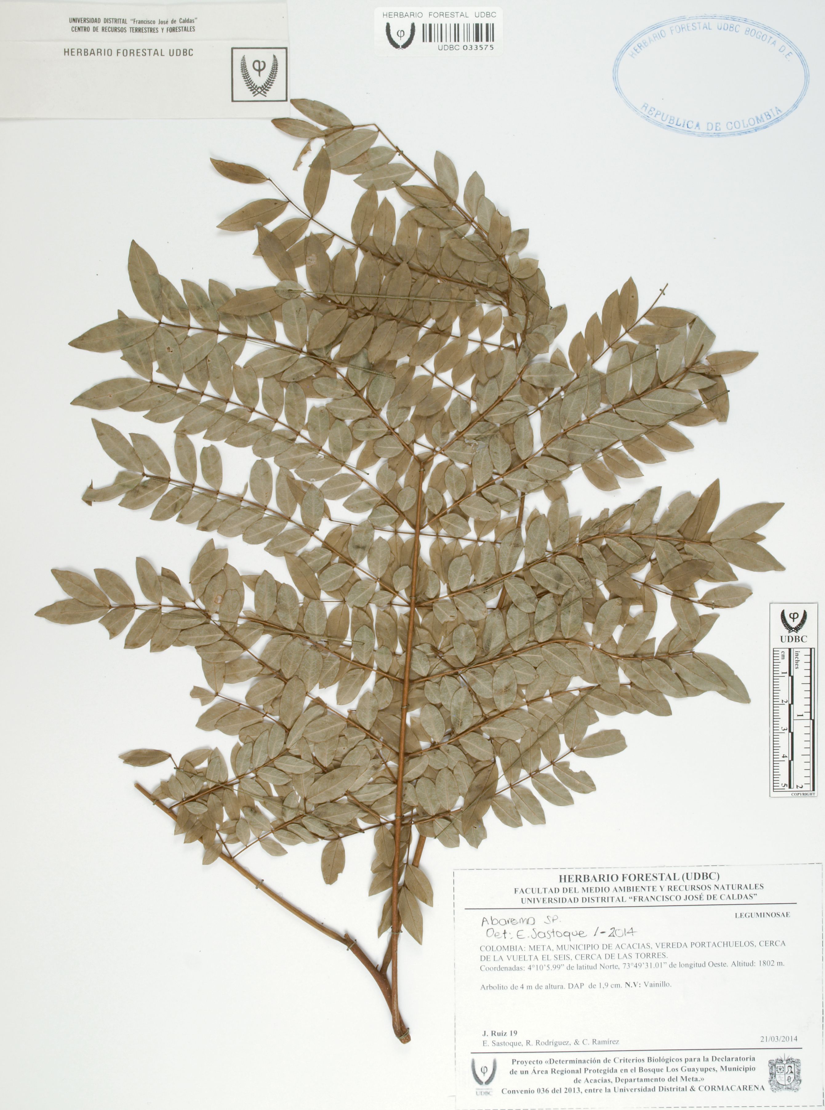 Fotografía del ejemplar Ruiz, J. 19, determinado como Abarema sp. en el año 2014