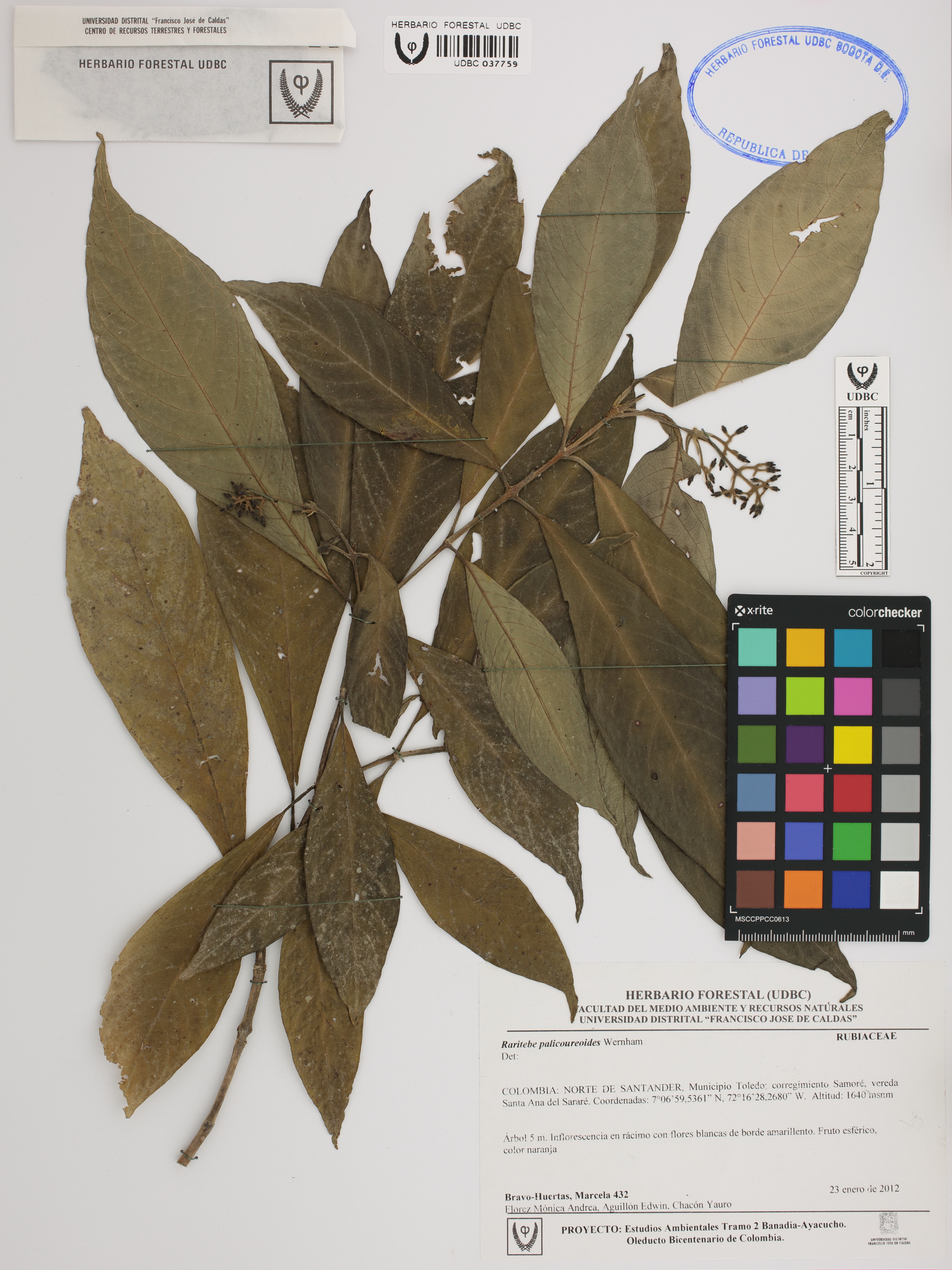 Fotografía del ejemplar Bravo-Huertas, M. 432, determinado como Raritebe palicoureoides
