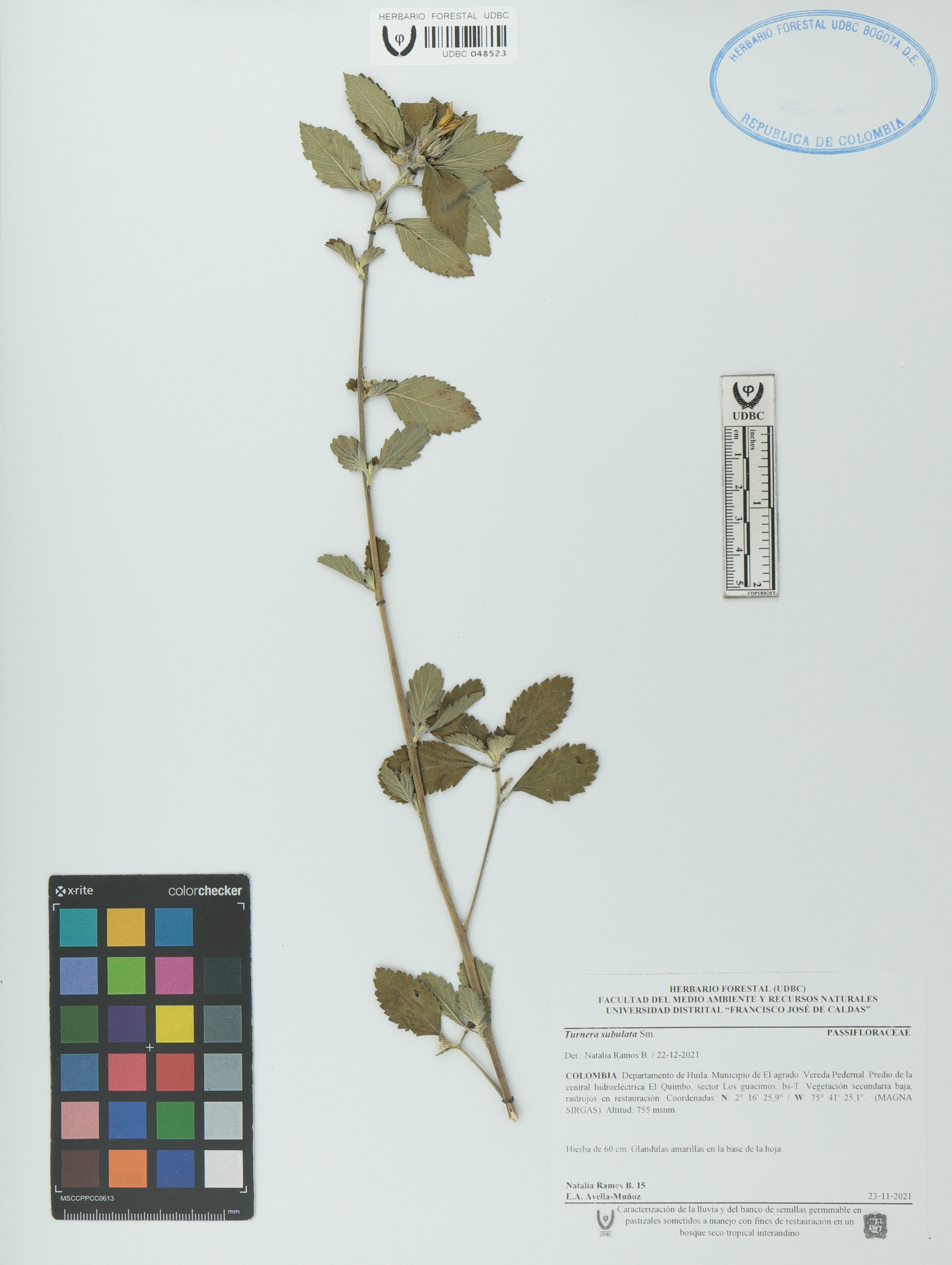 Fotografía del ejemplar Ramos-B., Natalia 15, determinado como Turnera subulata en el año 2021