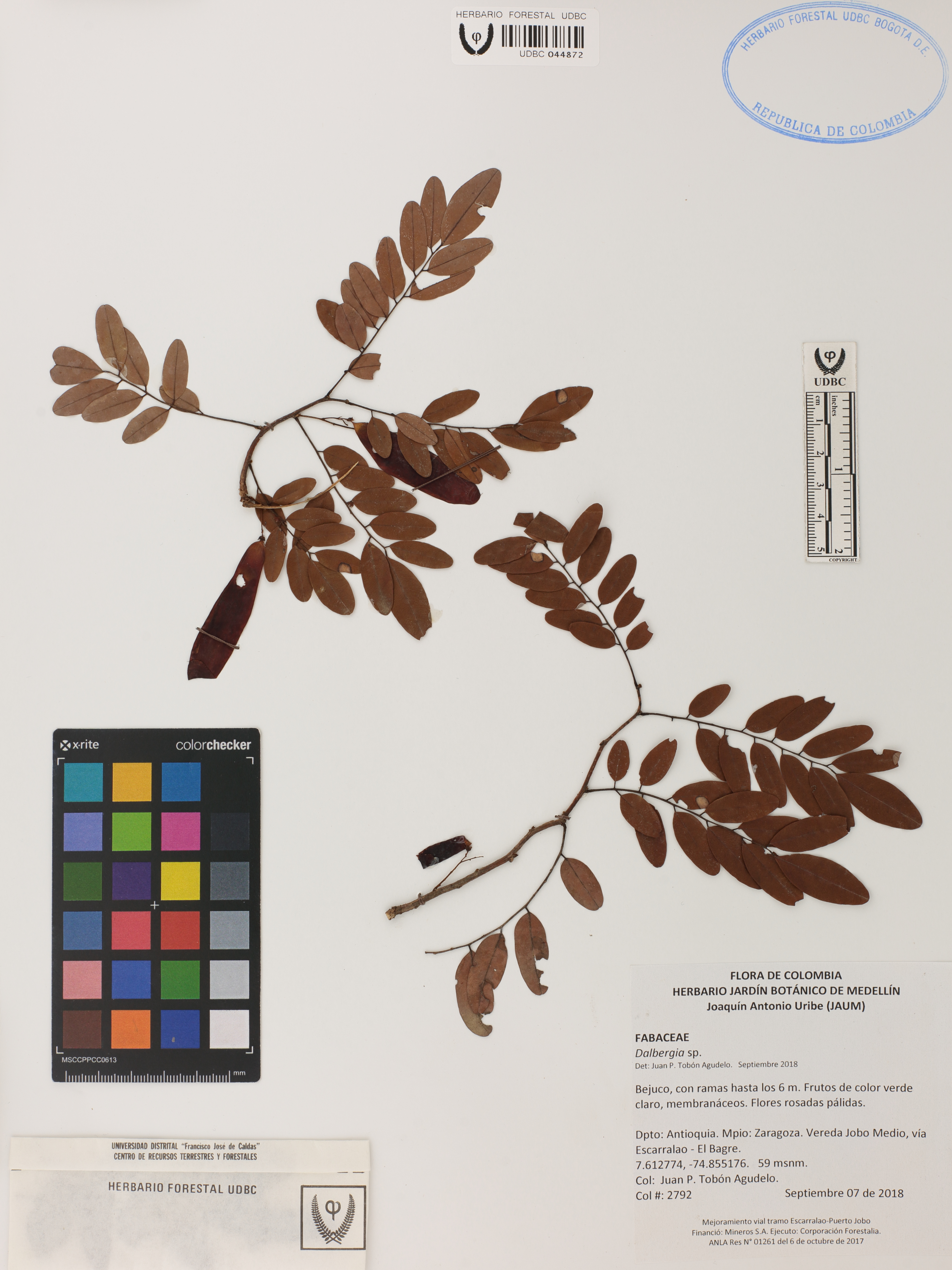 | dc.description | Fotografía del ejemplar Tobón-Agudelo, J. 2792, determinado como Dalbergia sp. en el año 2018 | |