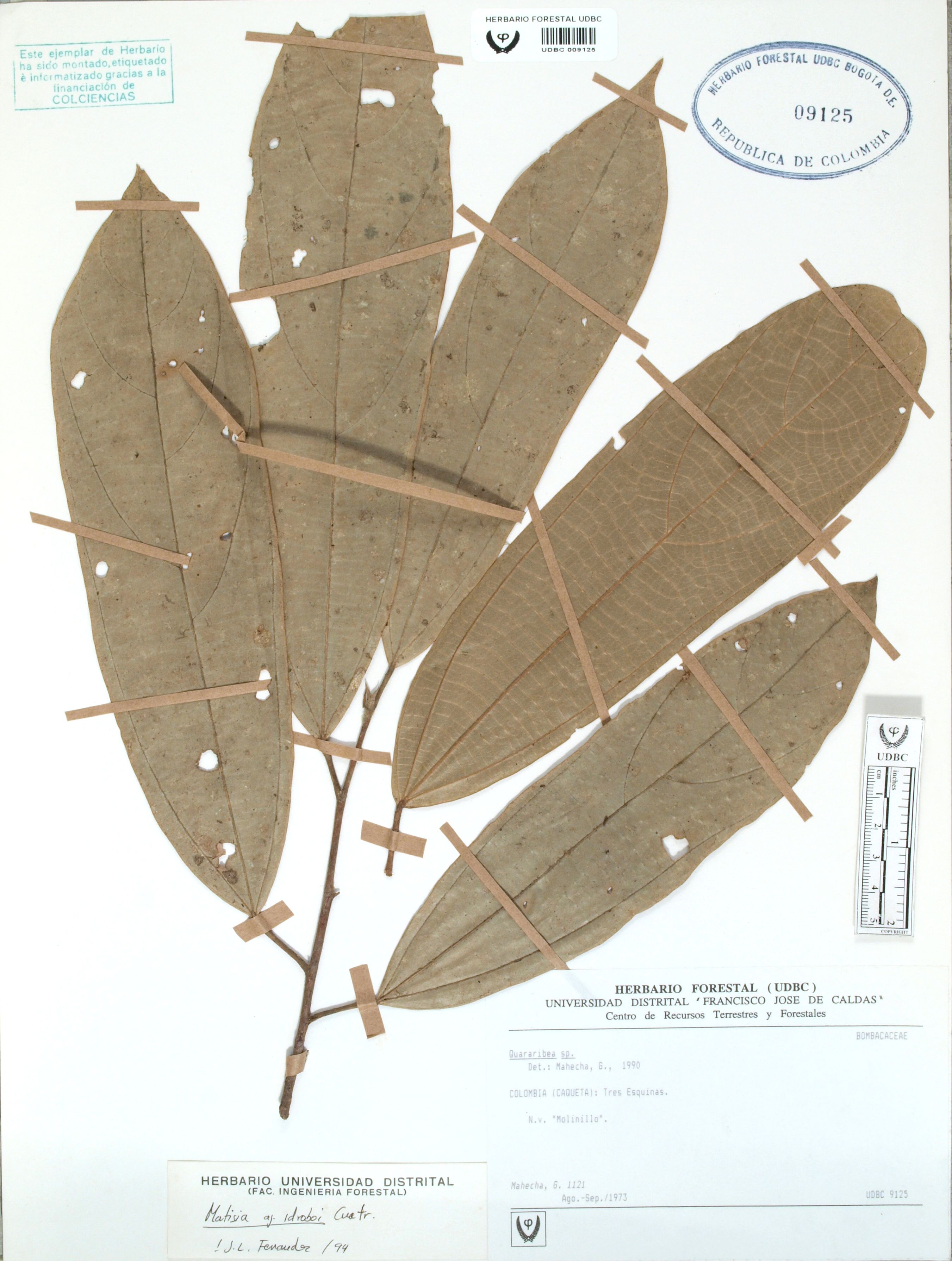 Fotografía del ejemplar Mahecha, G. 1121, determinado como Matisia idroboi en el año 1994