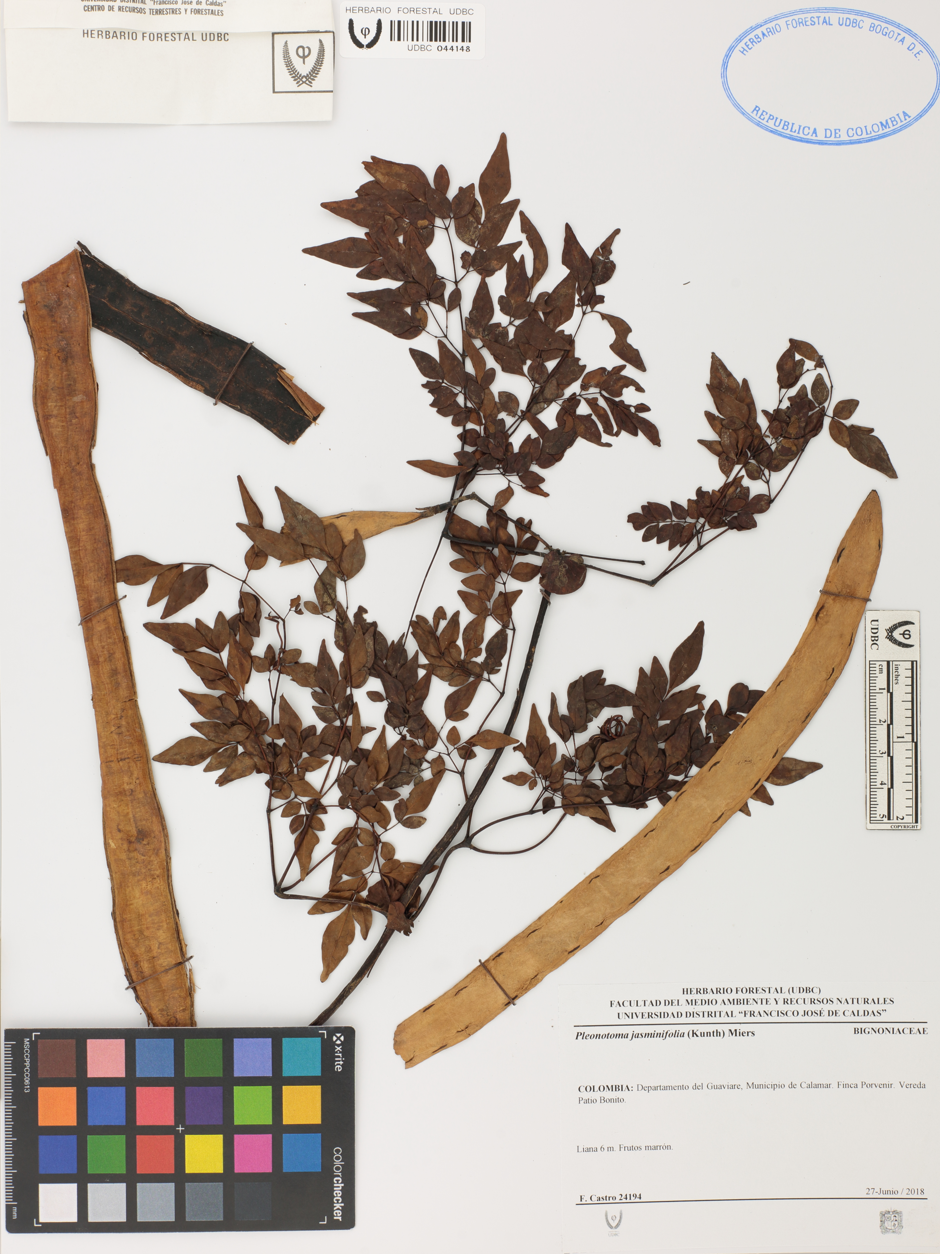 Fotografía del ejemplar Castro, F. 24194, determinado como Pleonotoma jasminifolia