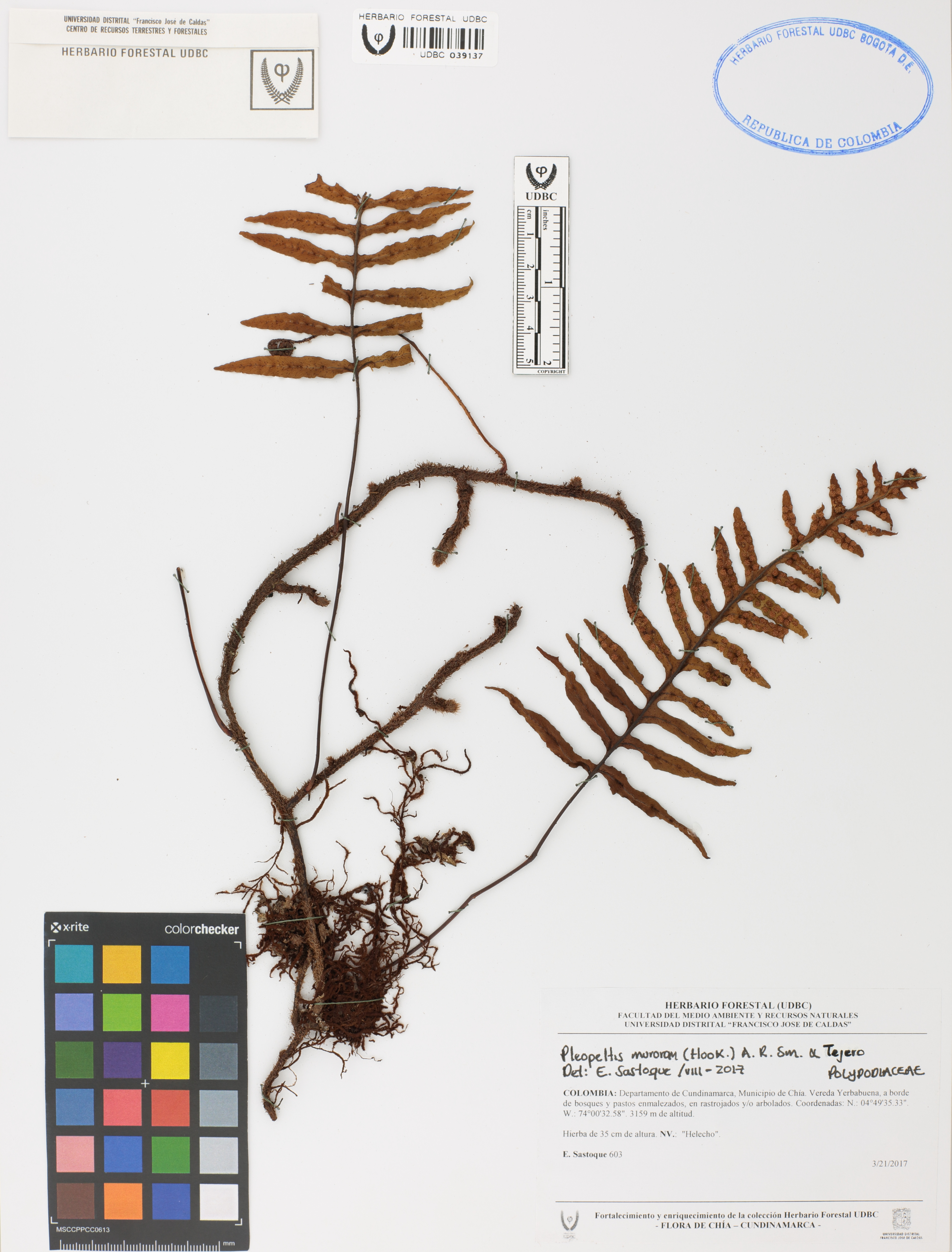 Fotografía del ejemplar Sastoque, E. 603, determinado como Pleopeltis murorum en el año 2017