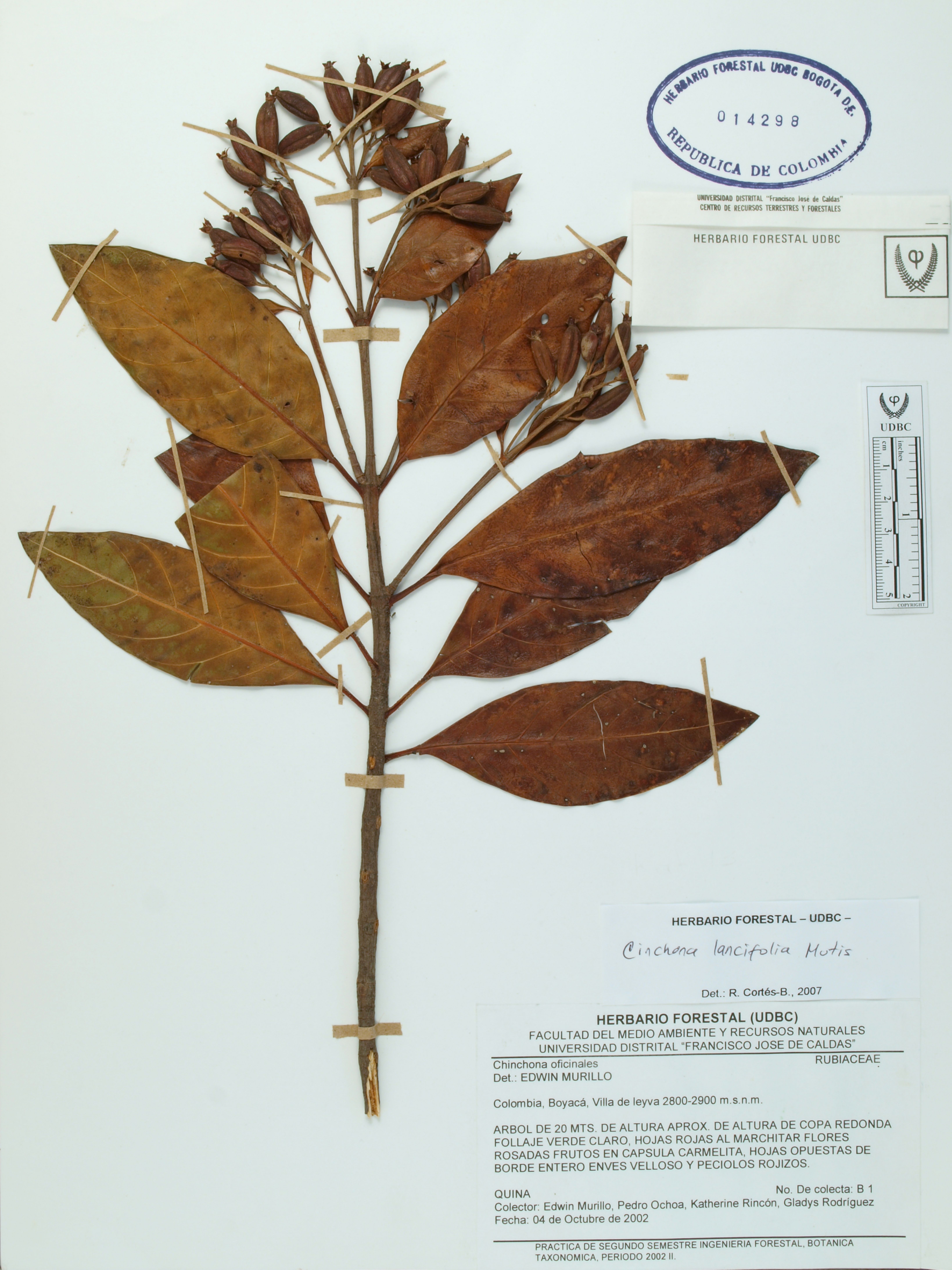 Fotografía del ejemplar Murillo, E. 1, determinado como Cinchona lancifolia