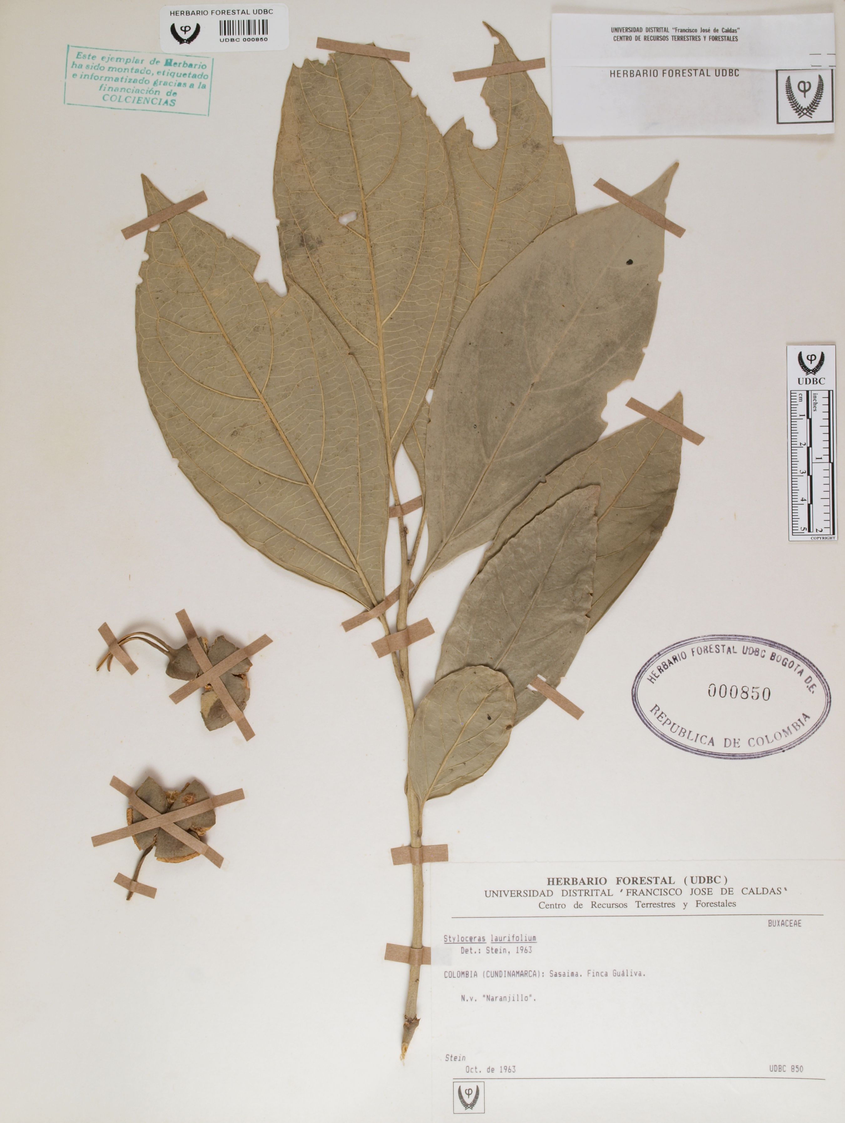 Fotografía del ejemplar Stein, B., determinado como Styloceras laurifolium en el año 1963
