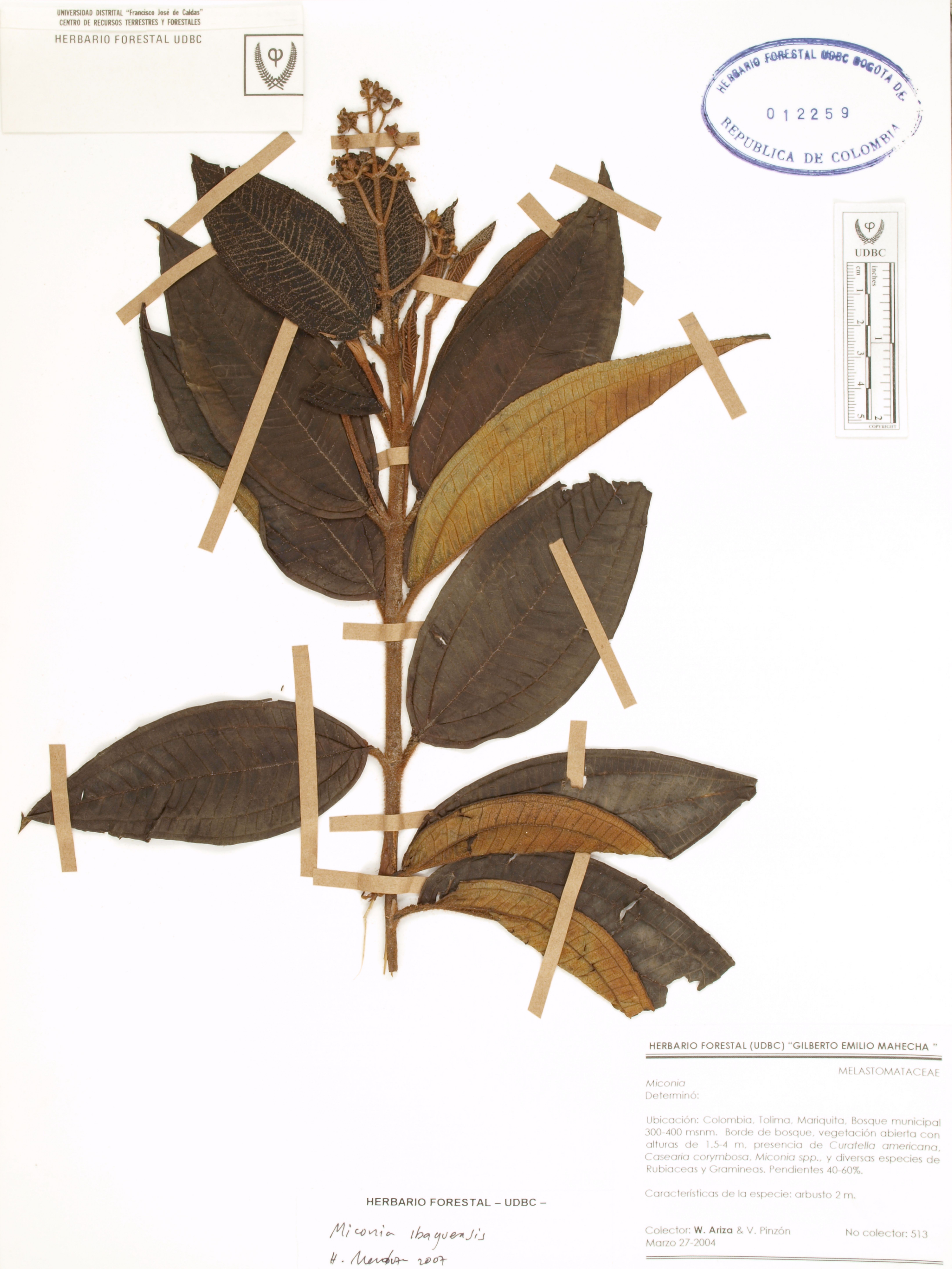 Fotografía del ejemplar Ariza, W. 513, determinado como Miconia ibaguensis en el año 2007