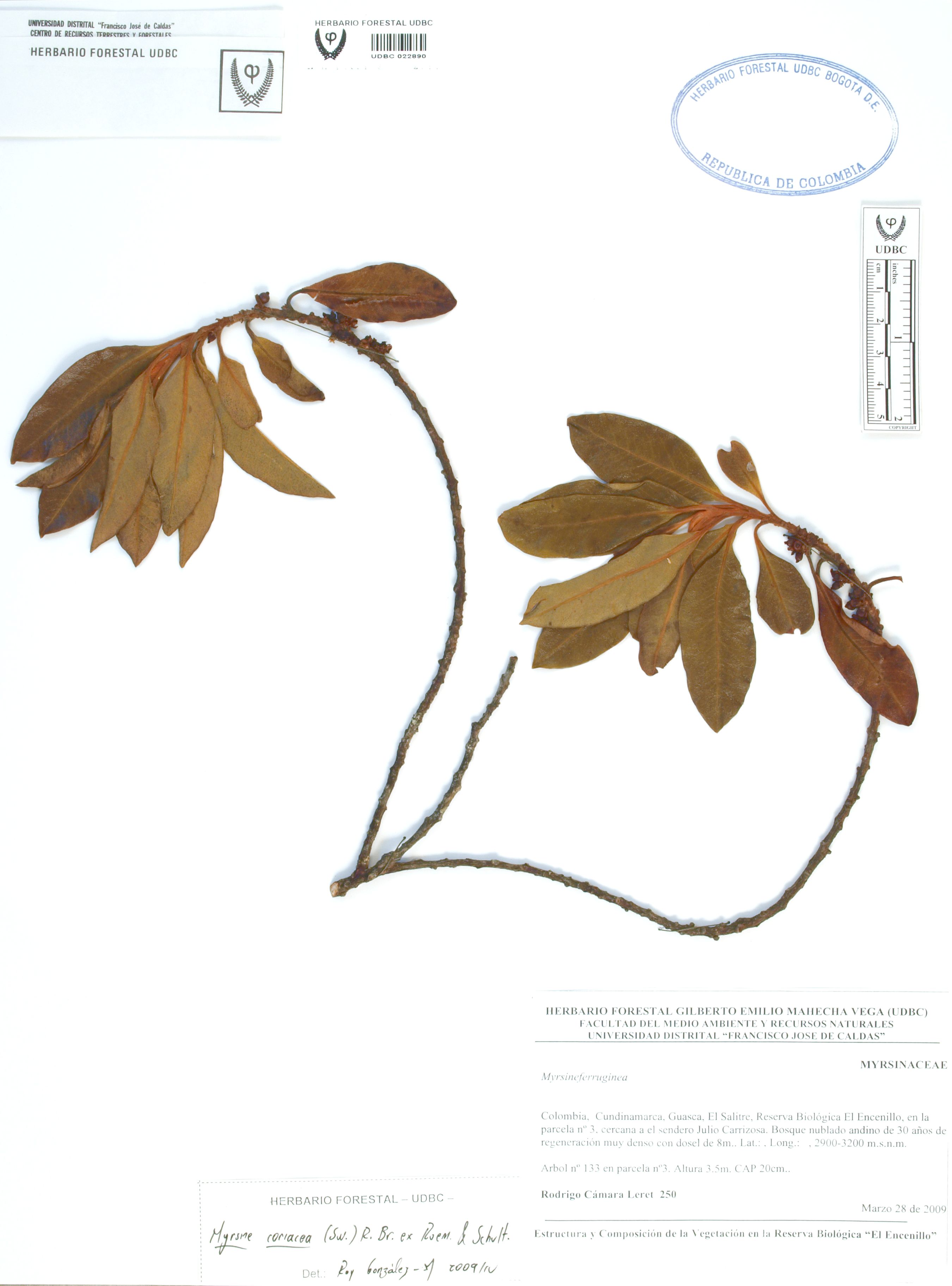 Fotografía del ejemplar Cámara, R. 250, determinado como Myrsine coriacea en el año 2009